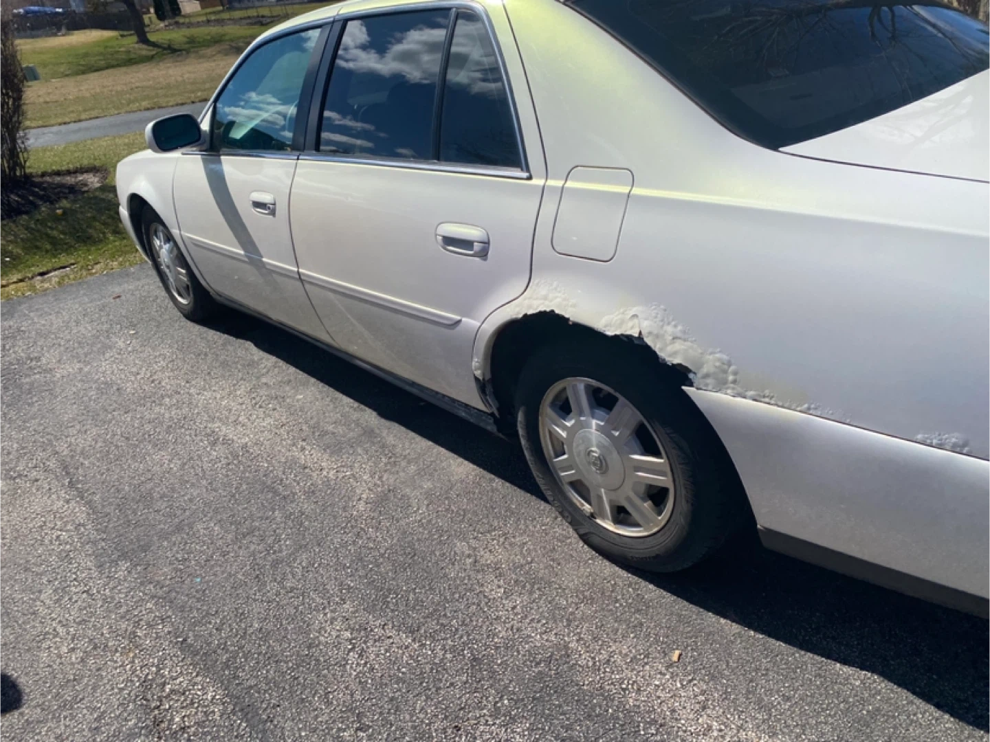 White Cadillac sedan with noticeable rust on the rear passenger side. This vehicle has a distinctive white exterior finish. It's a four-door sedan.