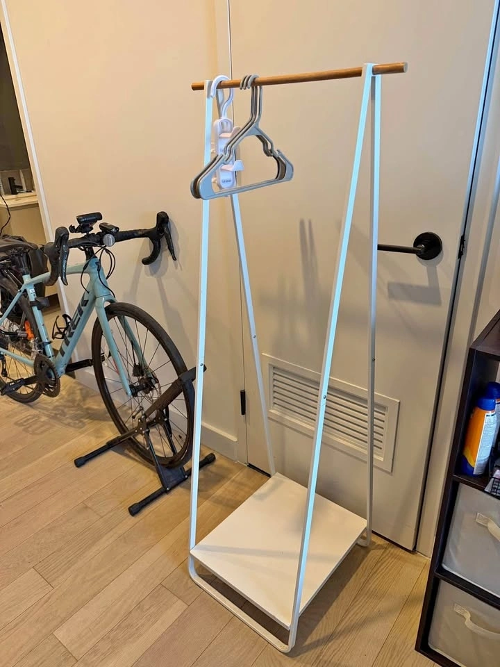 Nice Yamazaki Clothing Rack, great condition. Dimensions: 20.5"w x 18.5"d x 55.1"h. Steel frame, solid wood rod. Downtown Brooklyn pickup.