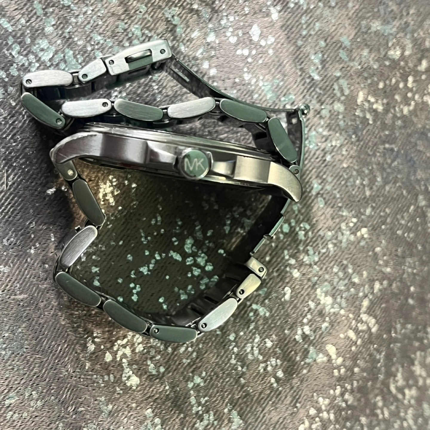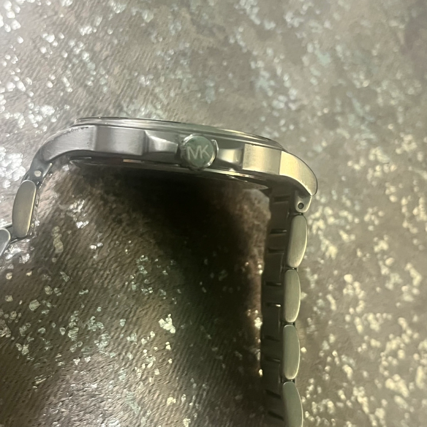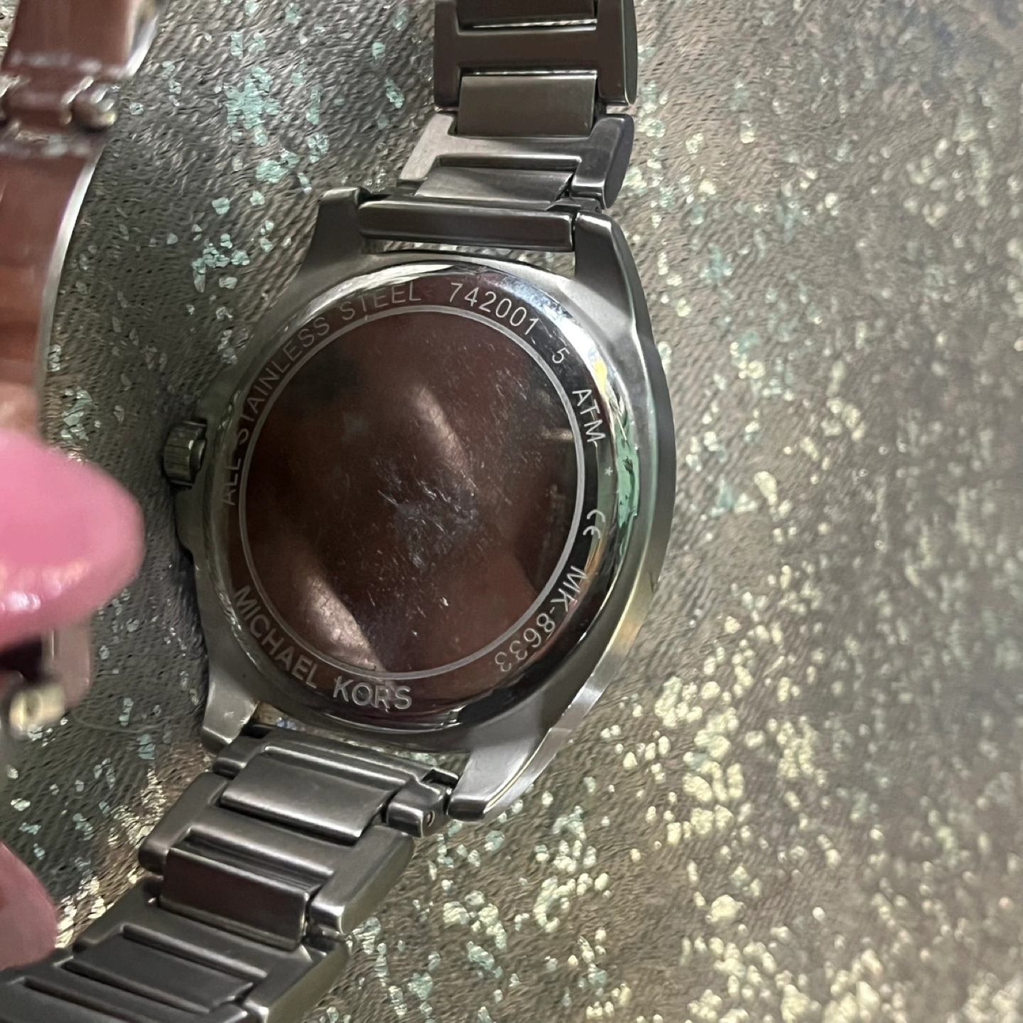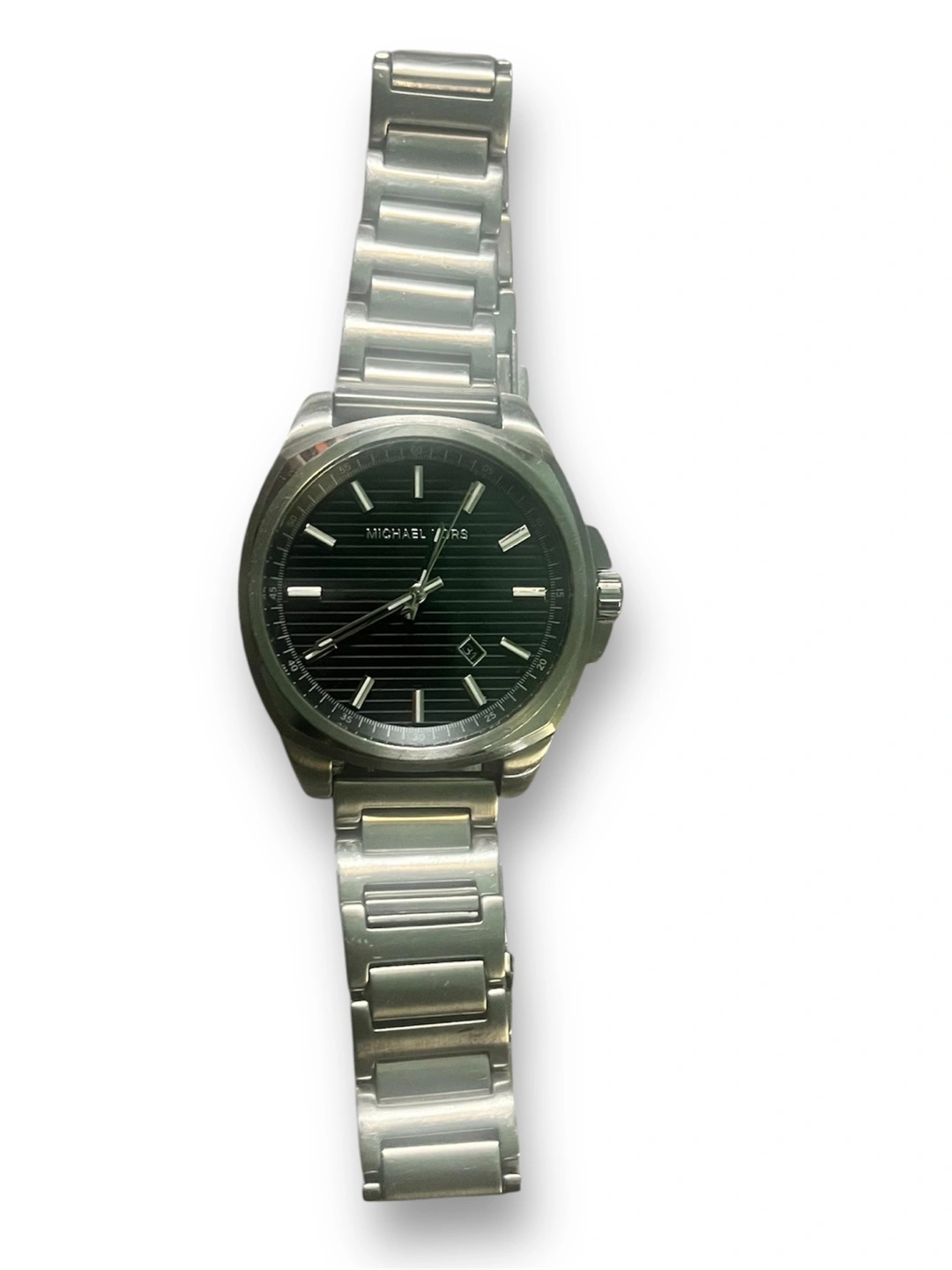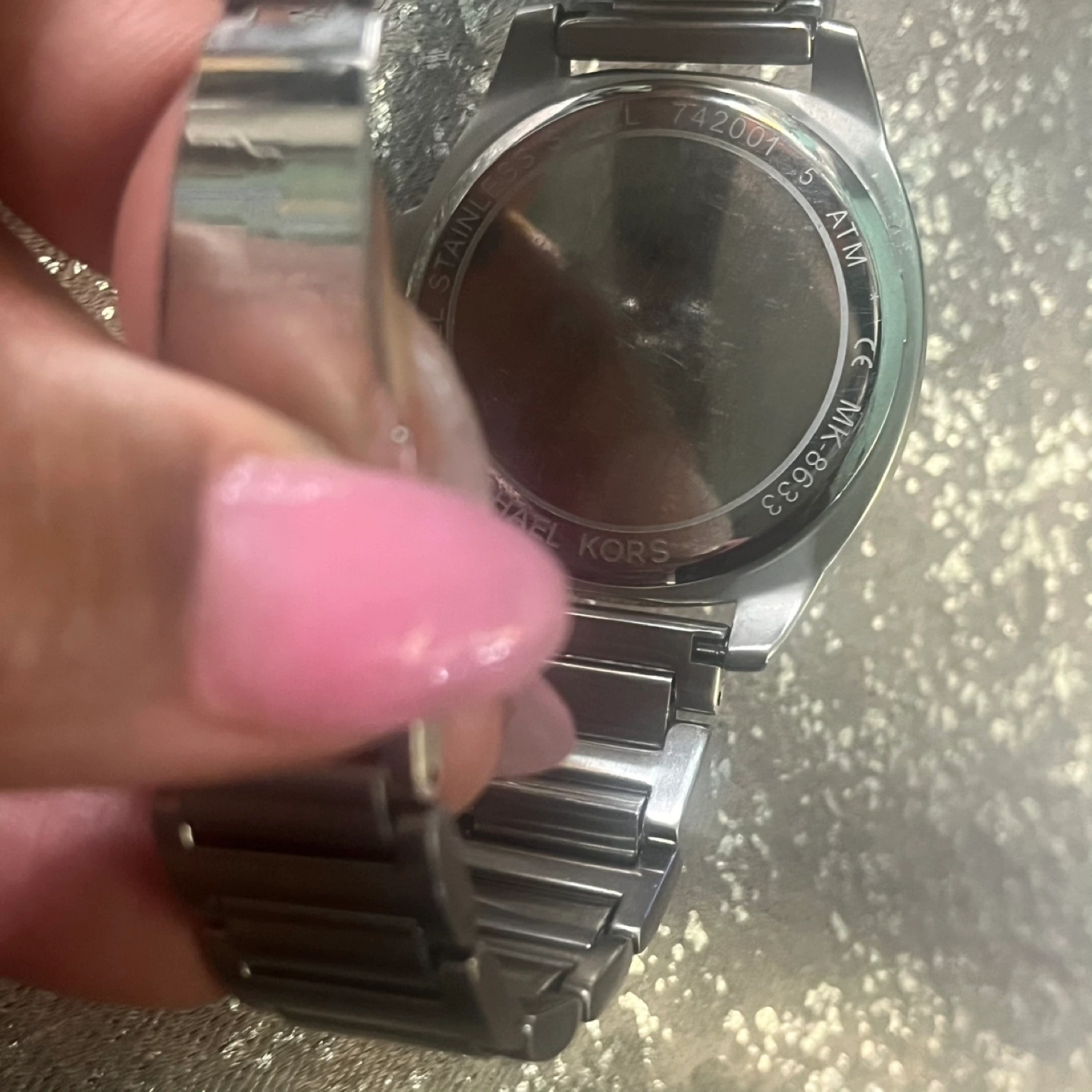 Selling a Michael Kors watch in stainless steel. The model number is MK-8633. It has a black face with a date window. The band is also stainless steel. Discontinued.