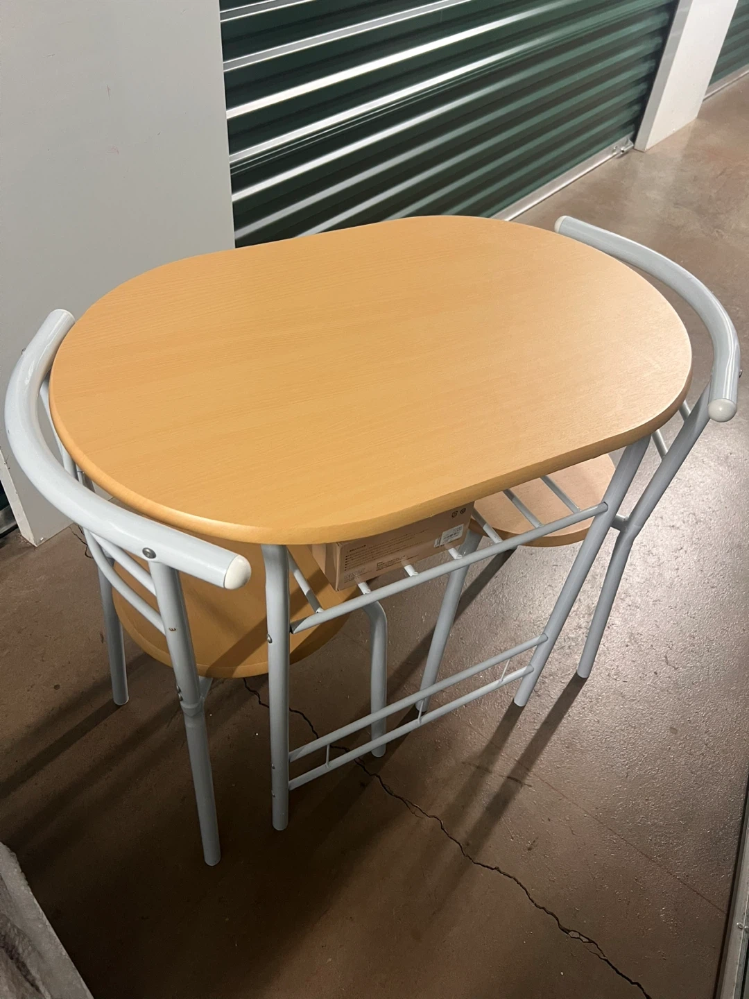 Selling a compact dining table set that includes the table and two chairs. It's perfect for a small space! The set features a light wood-colored tabletop and white metal frames. Great for apartments or breakfast nooks