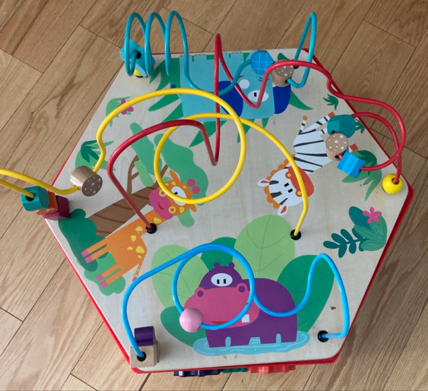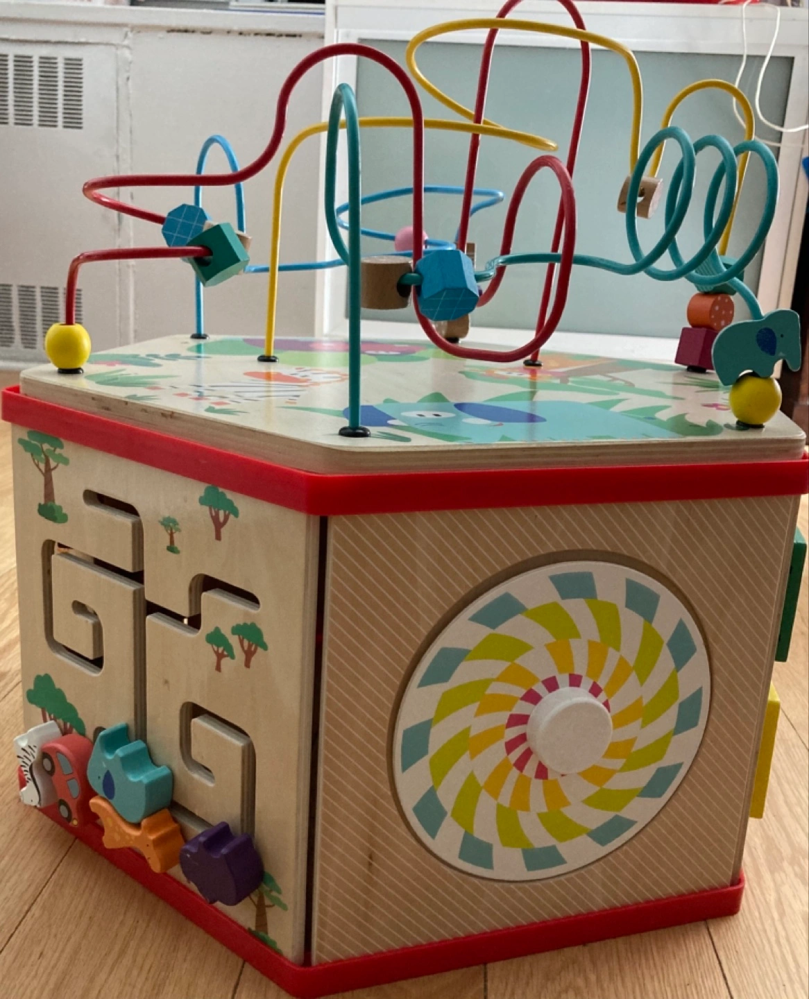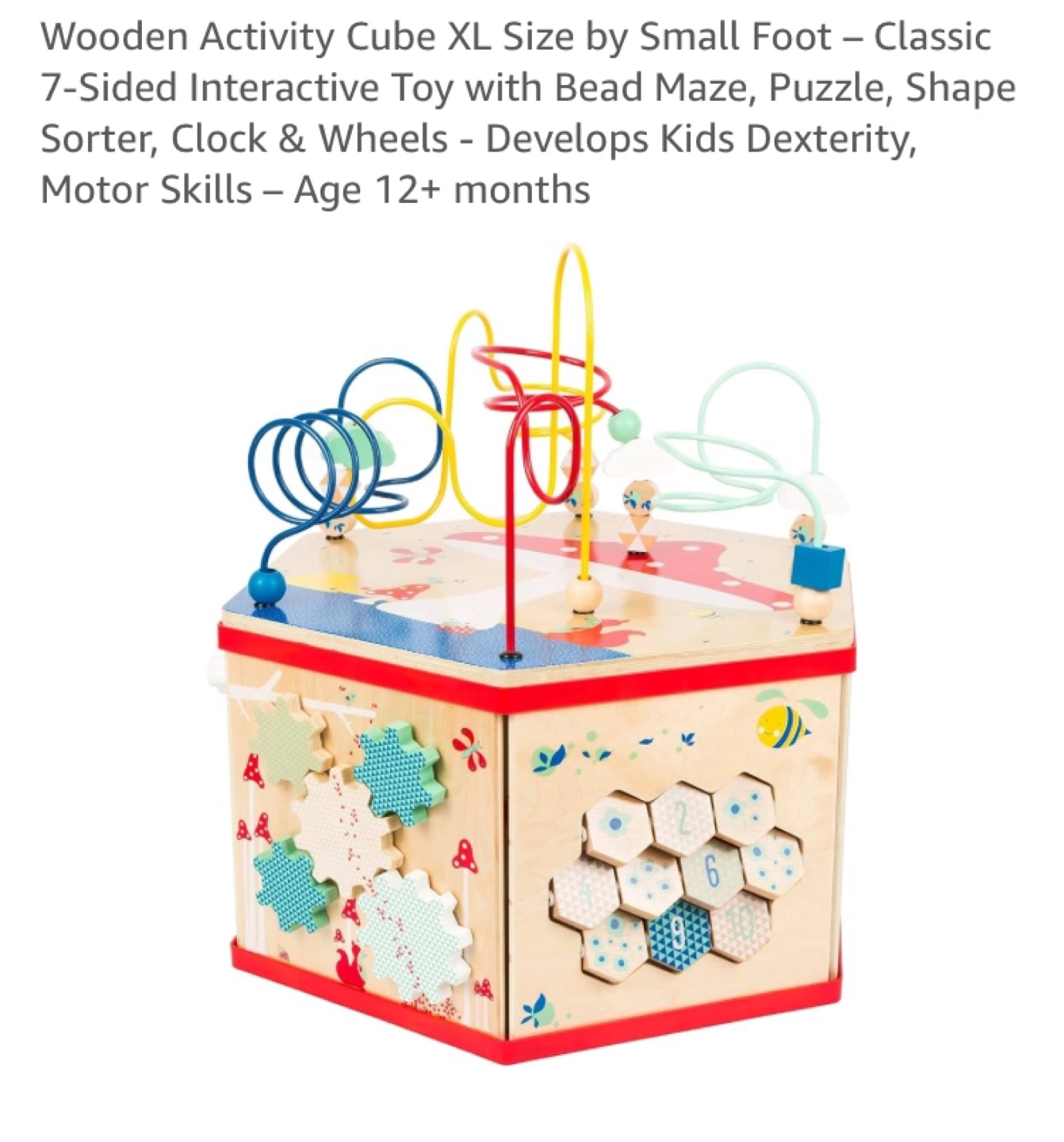 Classic 7-sided wooden activity cube. Features bead maze, puzzle, shape sorter, clock, and wheels. Develops dexterity and motor skills. Age 12+ months.
