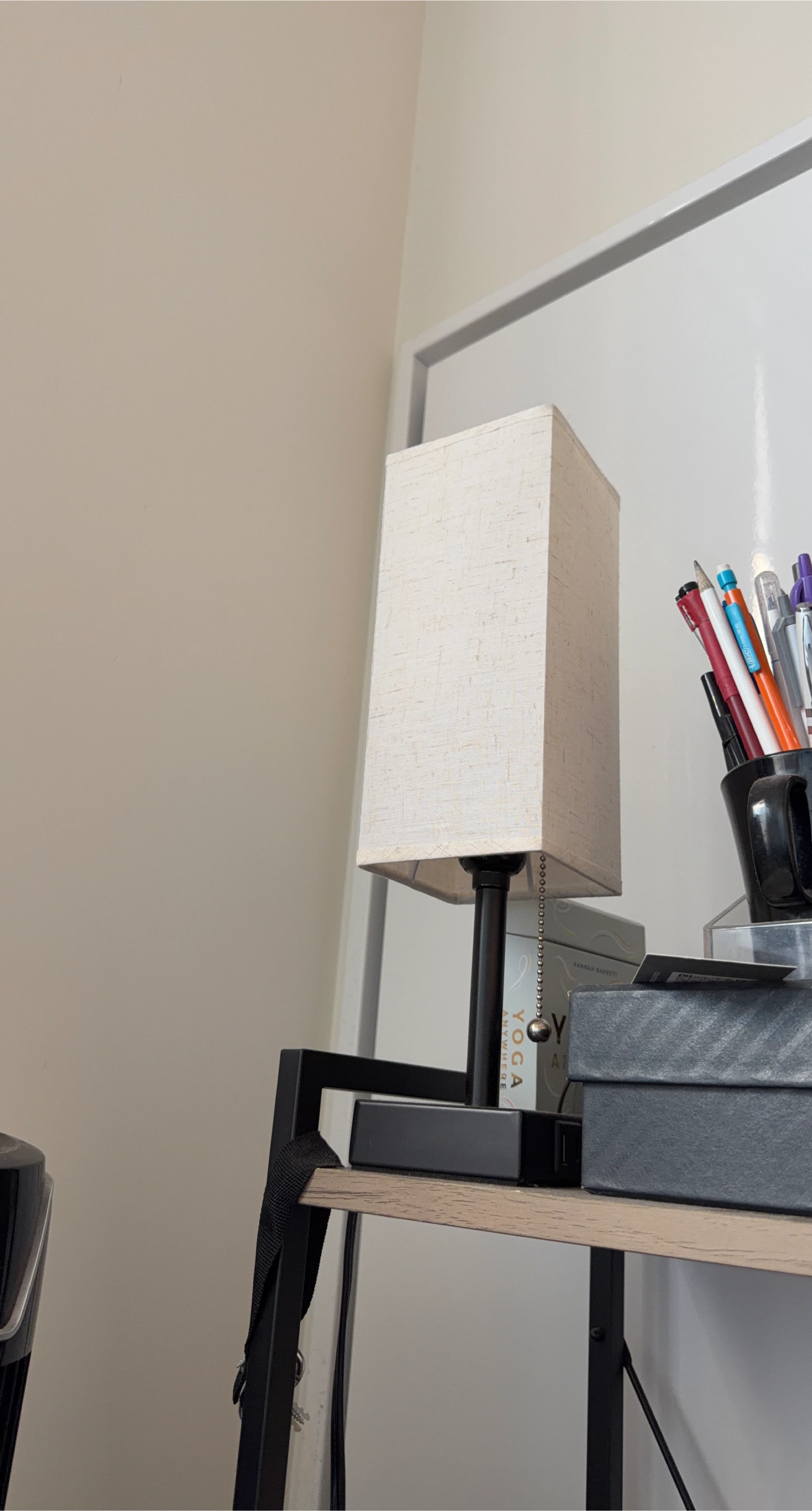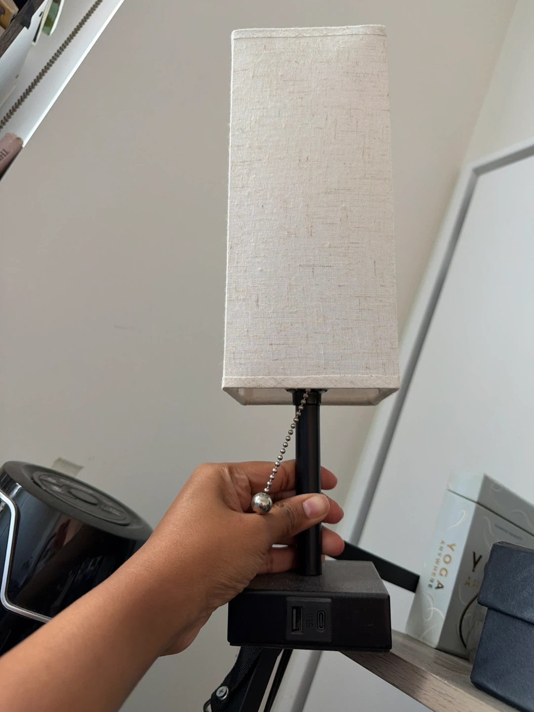 This is a cute little table lamp with a linen shade. It's perfect for a bedside table or desk. The base is black and has a USB port for charging your phone or other devices. It's in great condition and ready for a new home