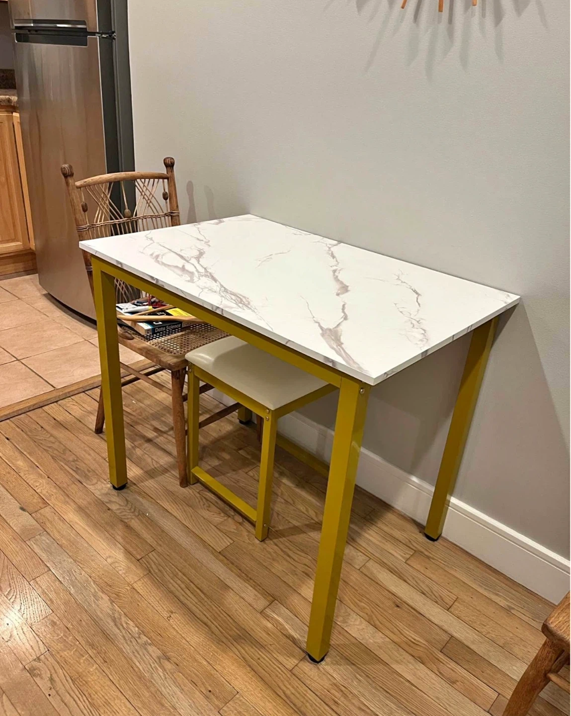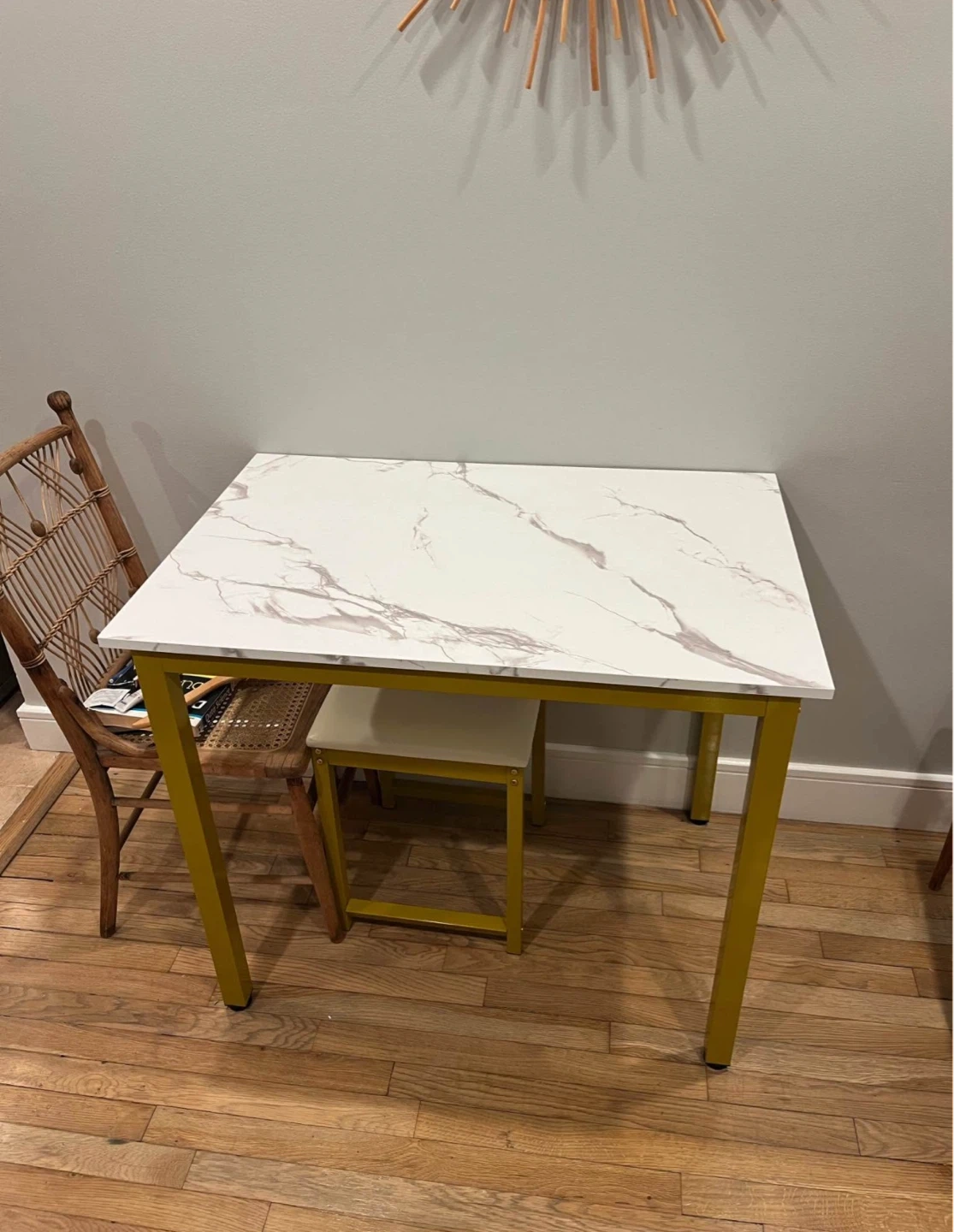 Selling a small table that features a marble-look top and striking yellow metal legs. It’s in great condition and perfect for a small space or as an accent table. The clean design will fit in with many decor styles!