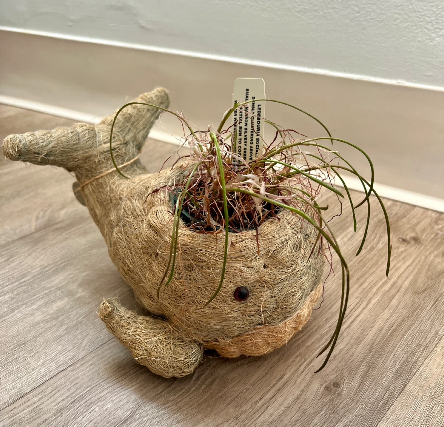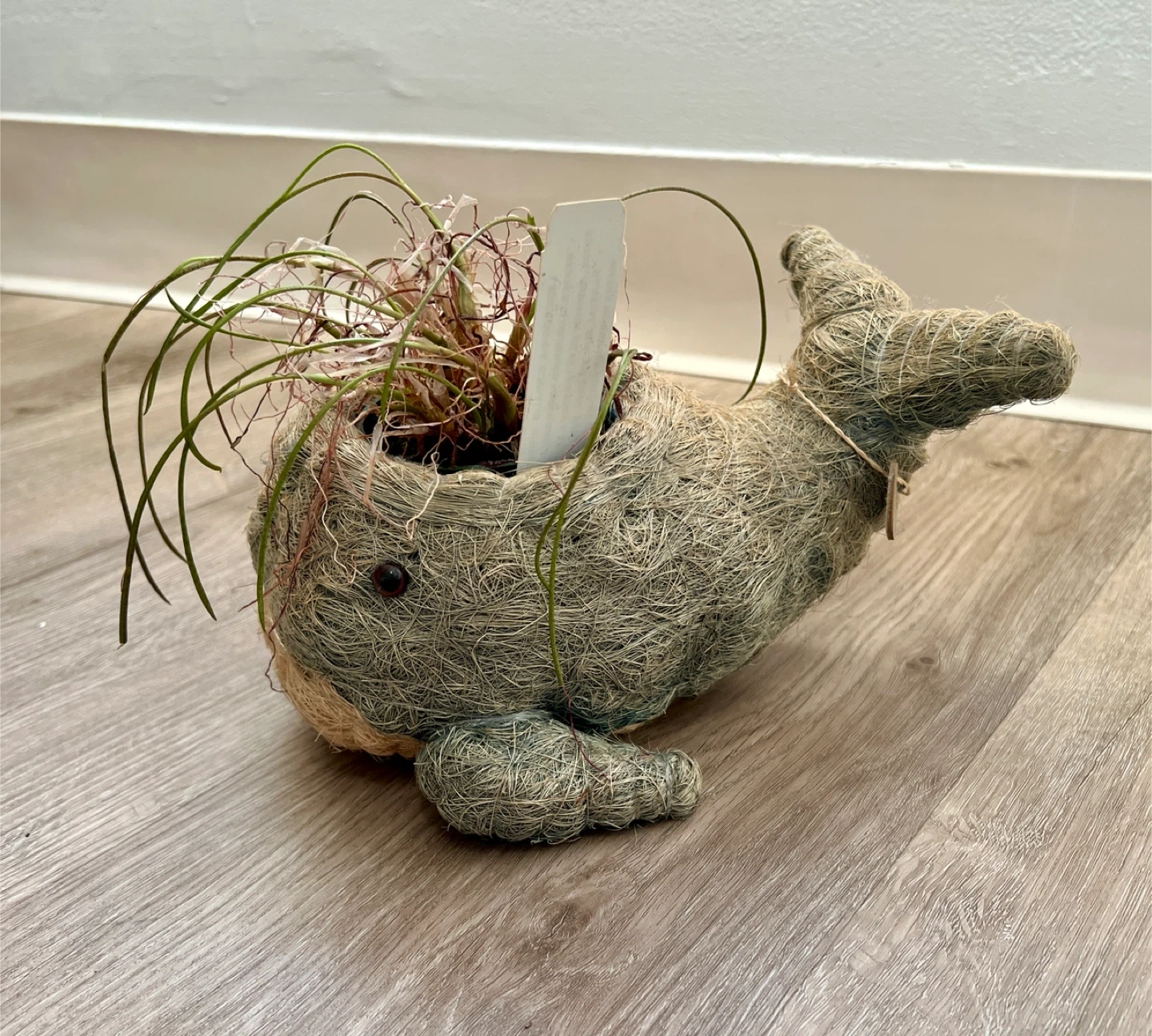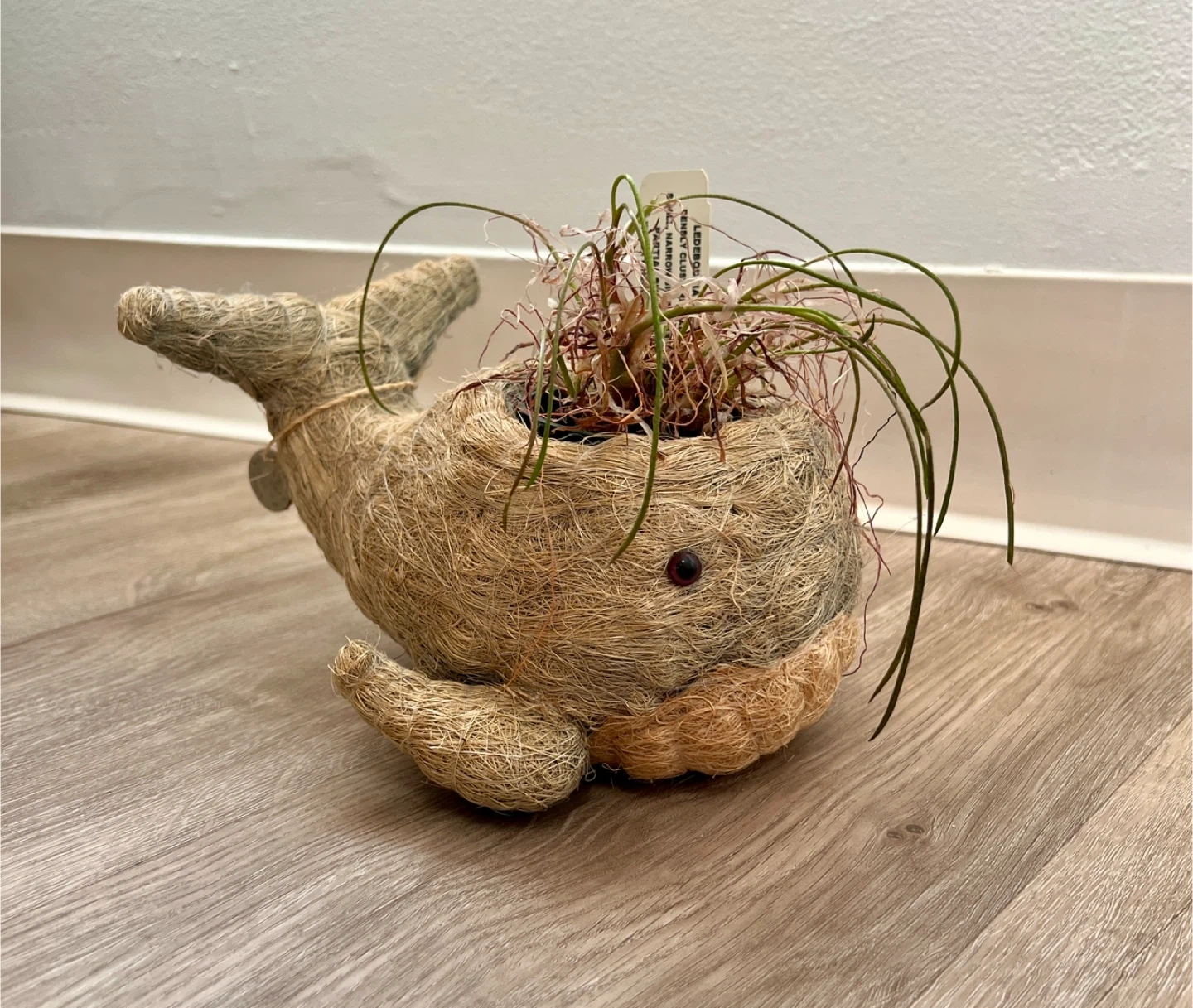 33Small bulb plant in a handmade, woven whale planter. Plant is low maintenance and doesn’t need water too often. Planter has gotten pretty faded from being in the sun but is still cute! Approx 9” wide and 7” tall.
