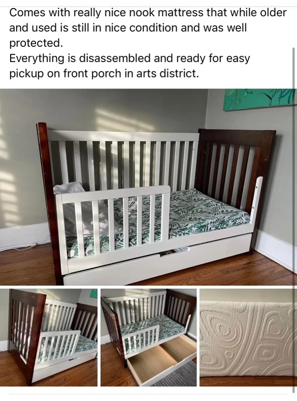 White crib with a brown wood trim and a storage drawer. It comes with a mattress. It is fully disassembled and ready for pickup. Weight limit is only 50 lbs