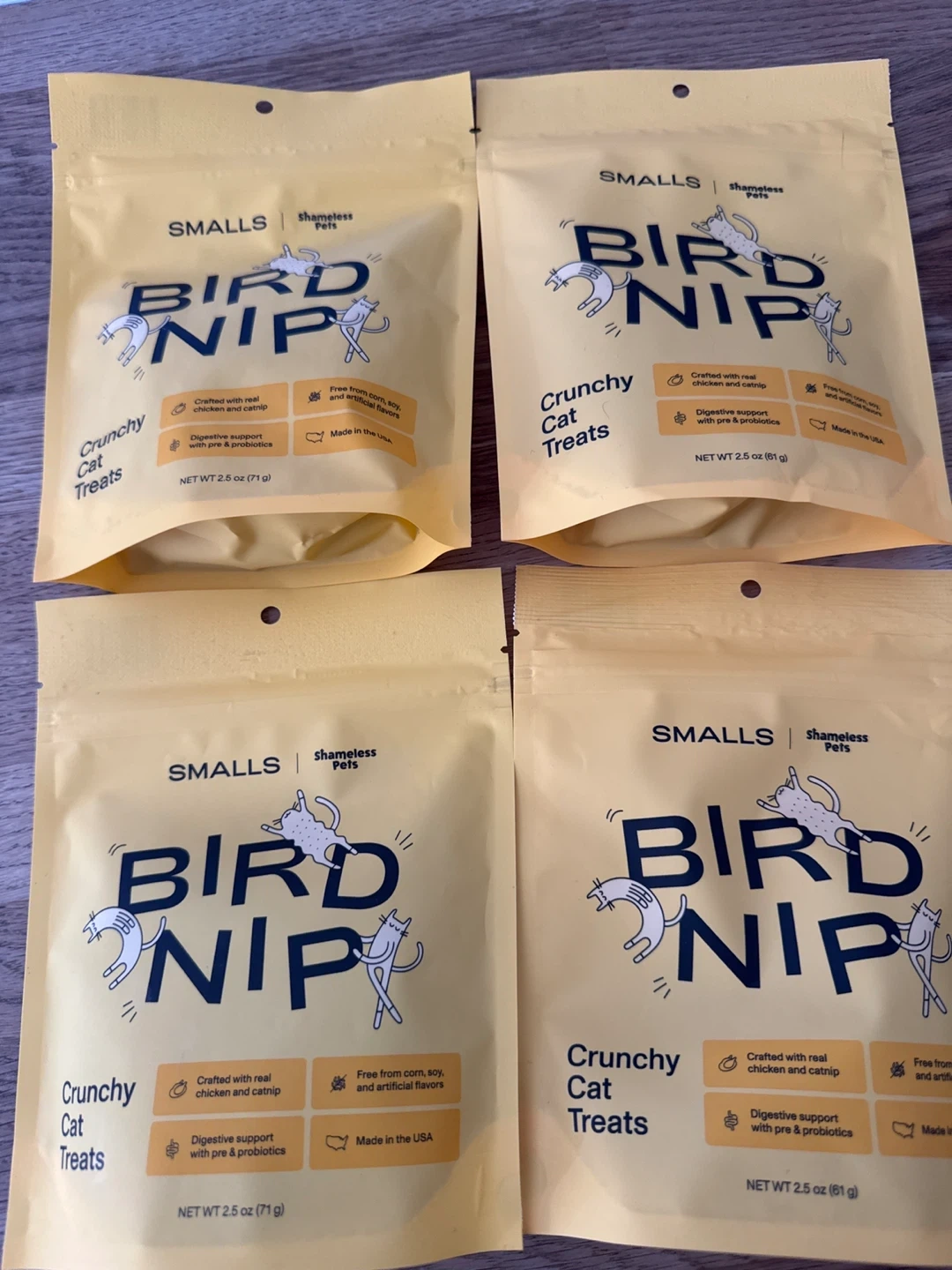 I have four bags of Smalls Bird Nip Crunchy Cat Treats. They are crafted with real chicken and catnip and provide digestive support with pre & probiotics. They are also free from corn, soy, and artificial flavors and made in the USA! Each bag has a net weight of 2.5 oz (71g).
