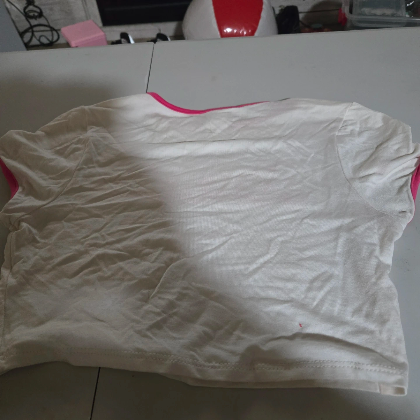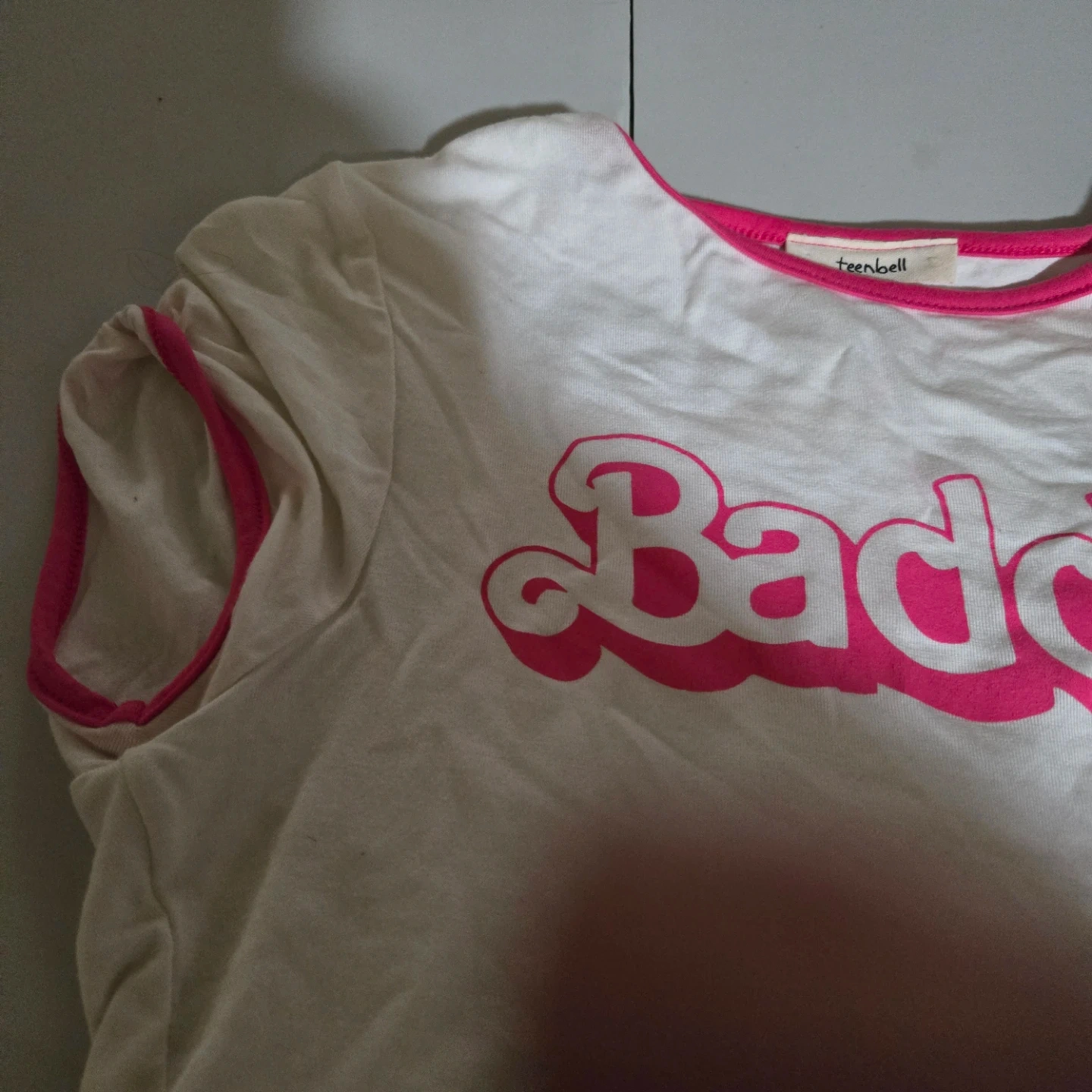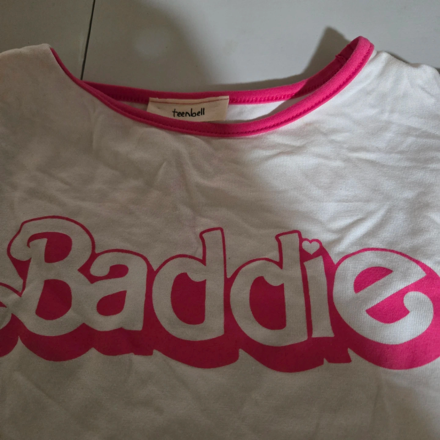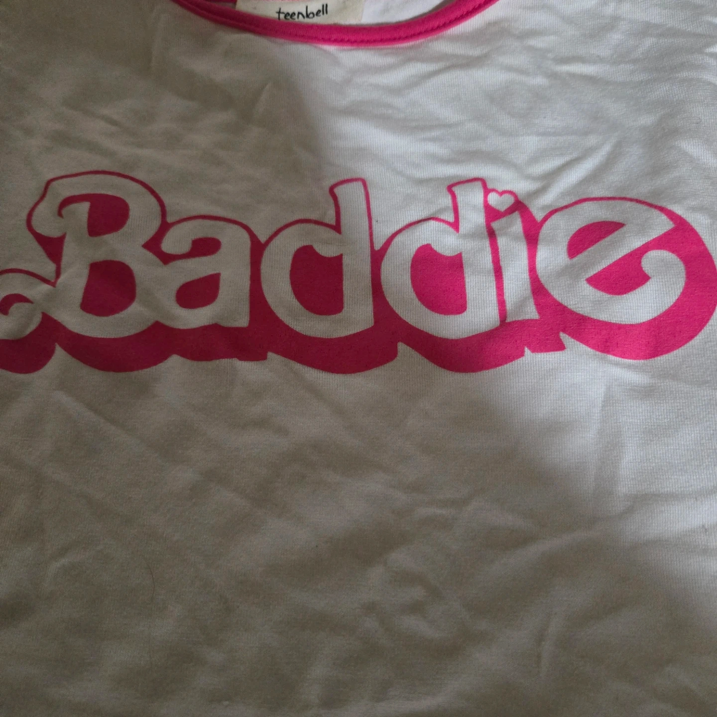 This is a white Teenbell t-shirt with "Baddie" in bright pink lettering. It has pink trim around the neckline and sleeves. The material is soft cotton.
