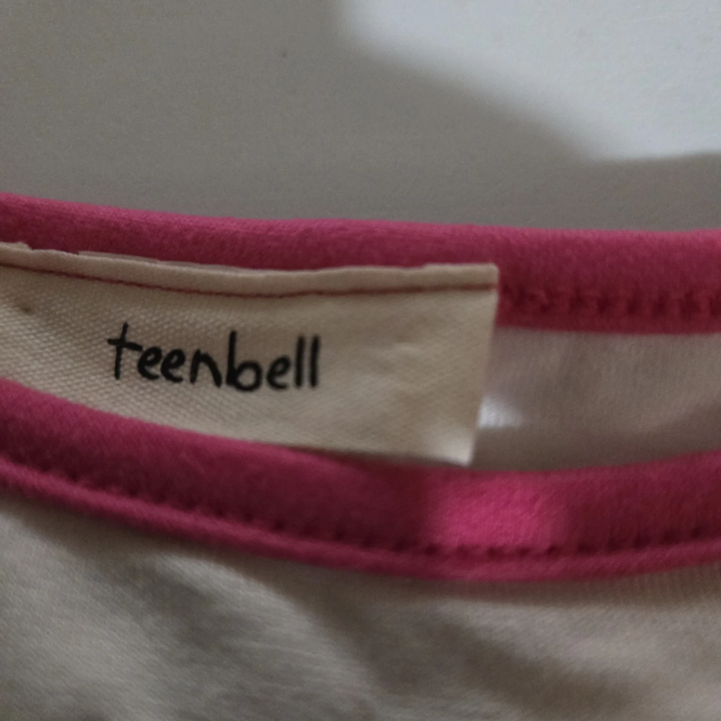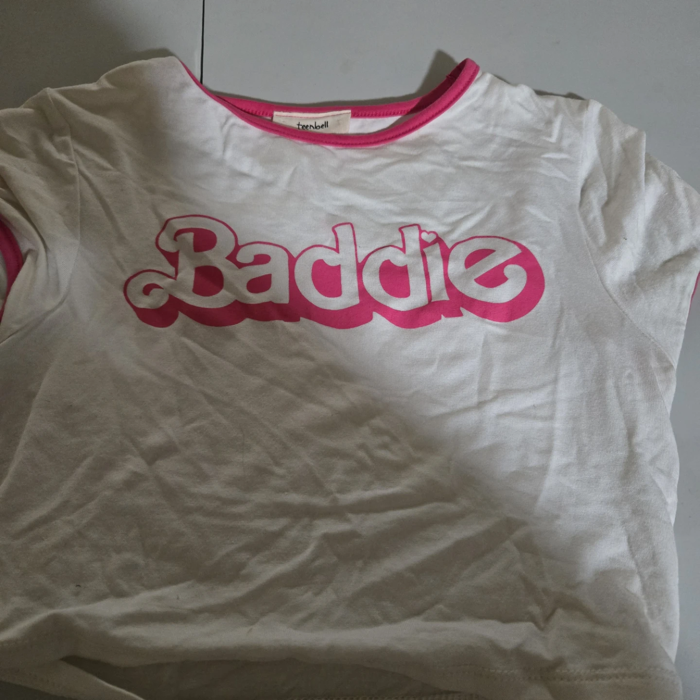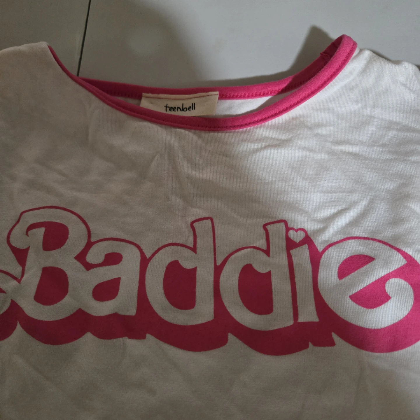 This is a white Teenbell t-shirt with "Baddie" in bright pink lettering. It has pink trim around the neckline and sleeves. The material is soft cotton.