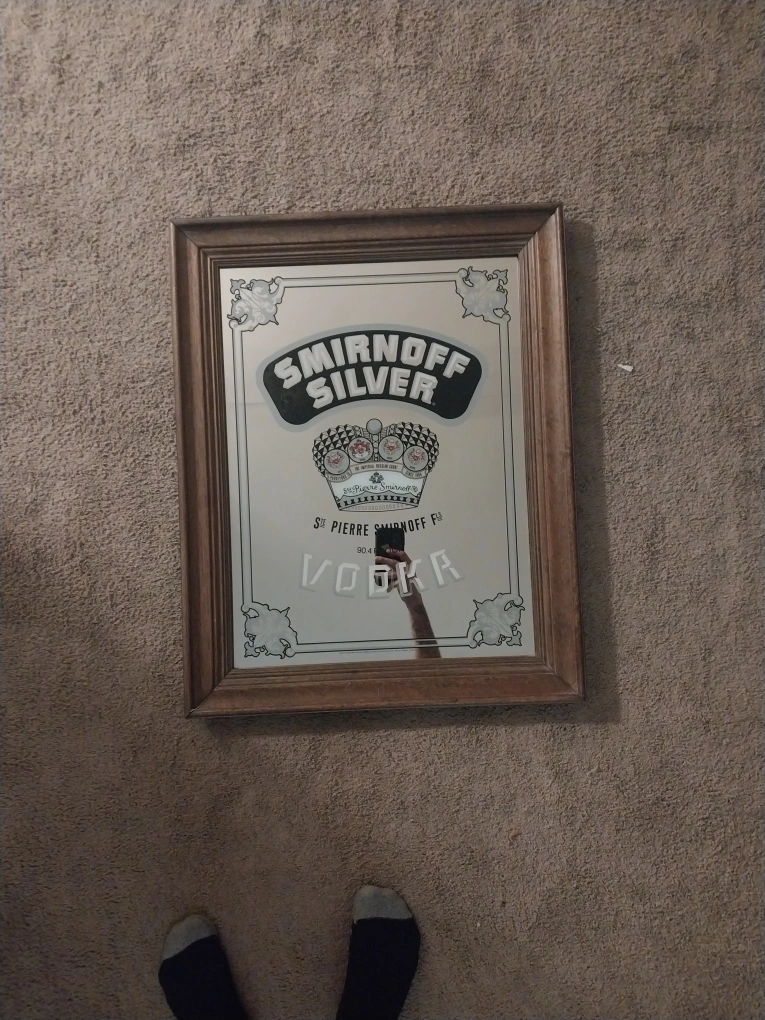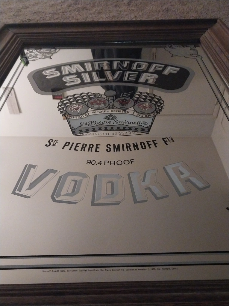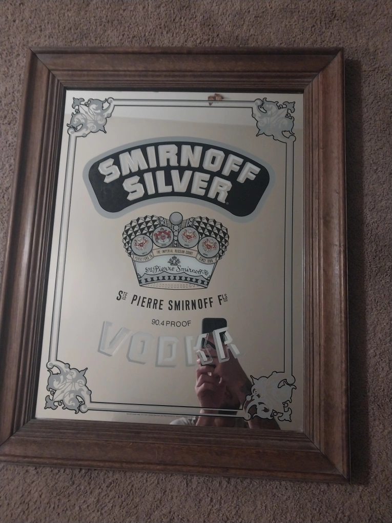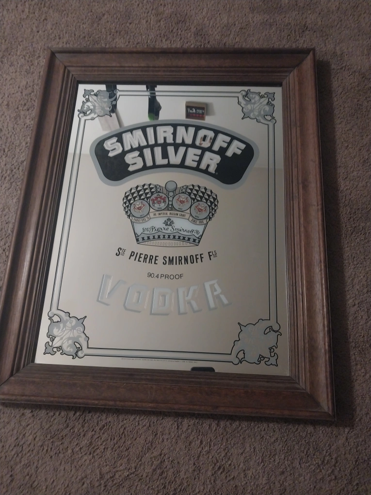Selling a Smirnoff Silver Vodka mirror. It has a wooden frame and would look great in a bar or game room! Vintage 1978 Smirnoff Silver Vodka Mirror Pub Bar Beer Sign 30 x 23 NICE FRAME
