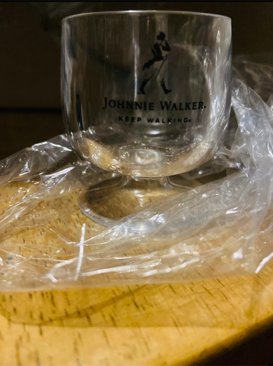 Set of Johnnie Walker whiskey glasses. Features the iconic "Keep Walking" slogan and striding man logo. Clear glass construction.