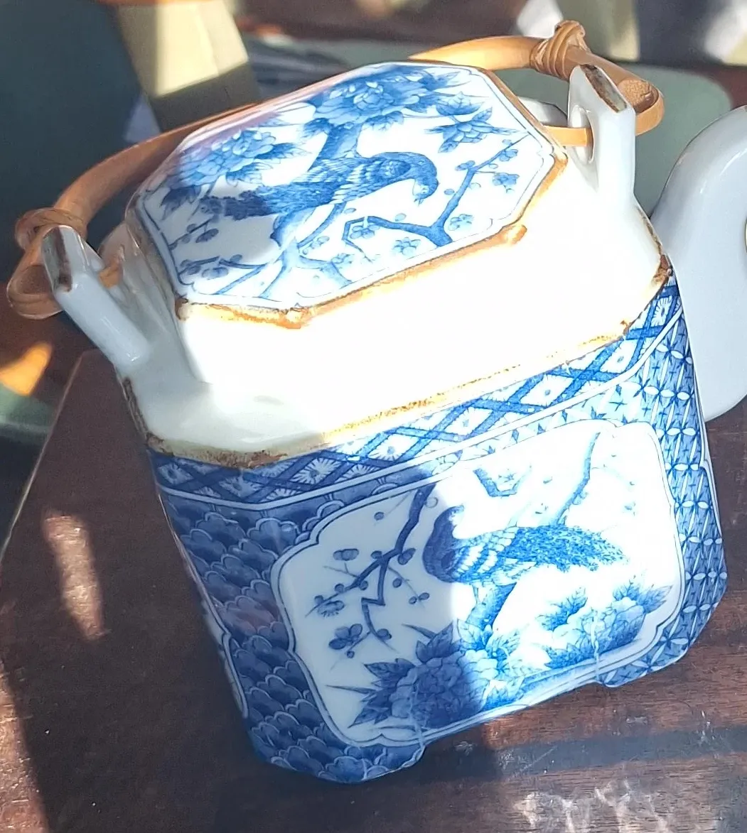 Selling a lovely vintage Japanese ceramic teapot. It features a beautiful blue and white bird and floral design, and a unique bamboo handle. Perfect for tea lovers or as a decorative piece!