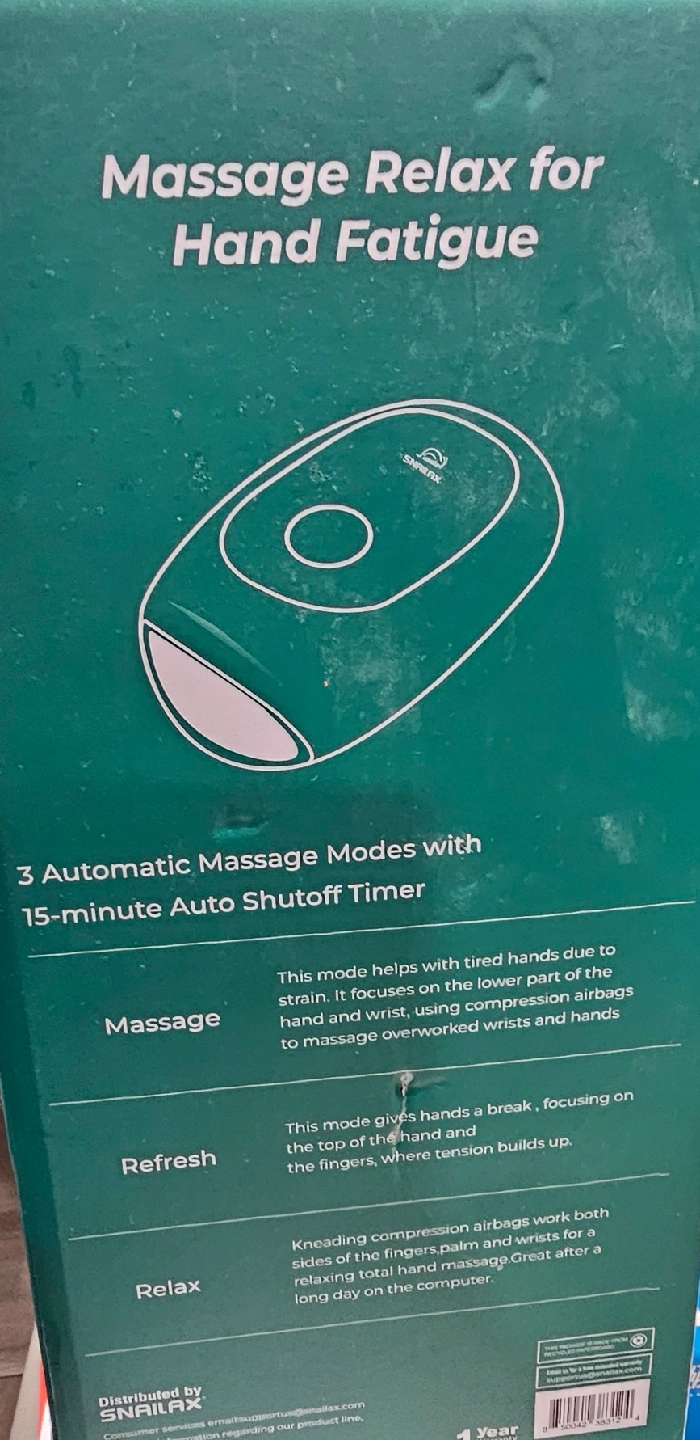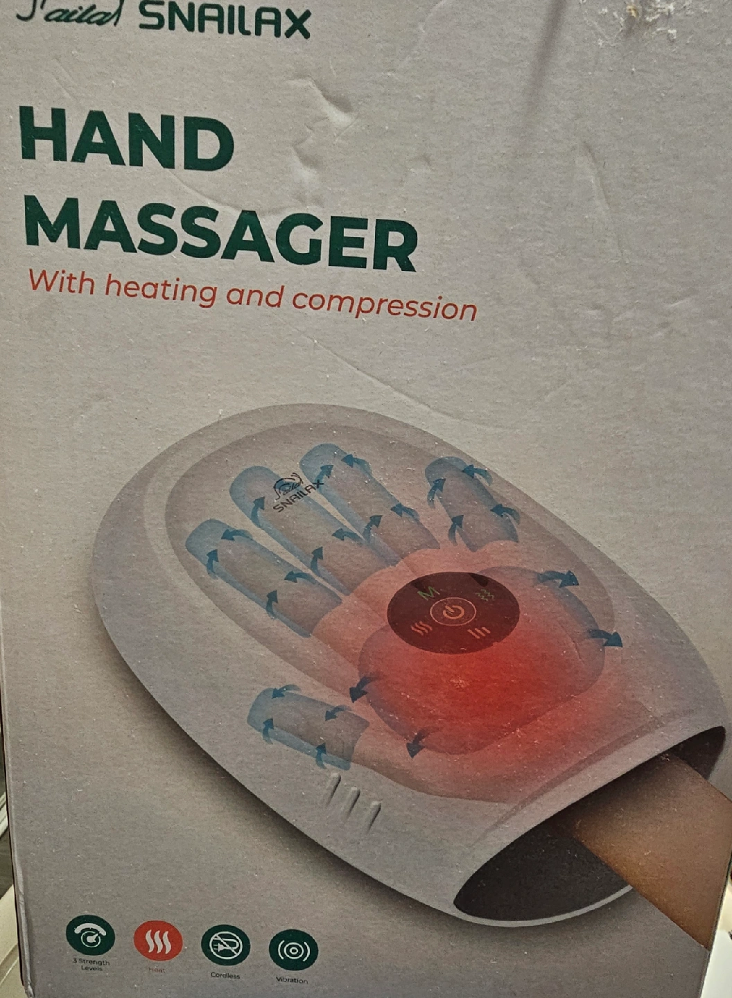 15I'm selling a Snailax Hand Massager! It comes with heating and compression features to help relax your hands. It has 3 strength levels and vibration. It is cordless with a long-lasting internal 18650 Lithium-ion battery, allowing easy travel to and from work or during long trips