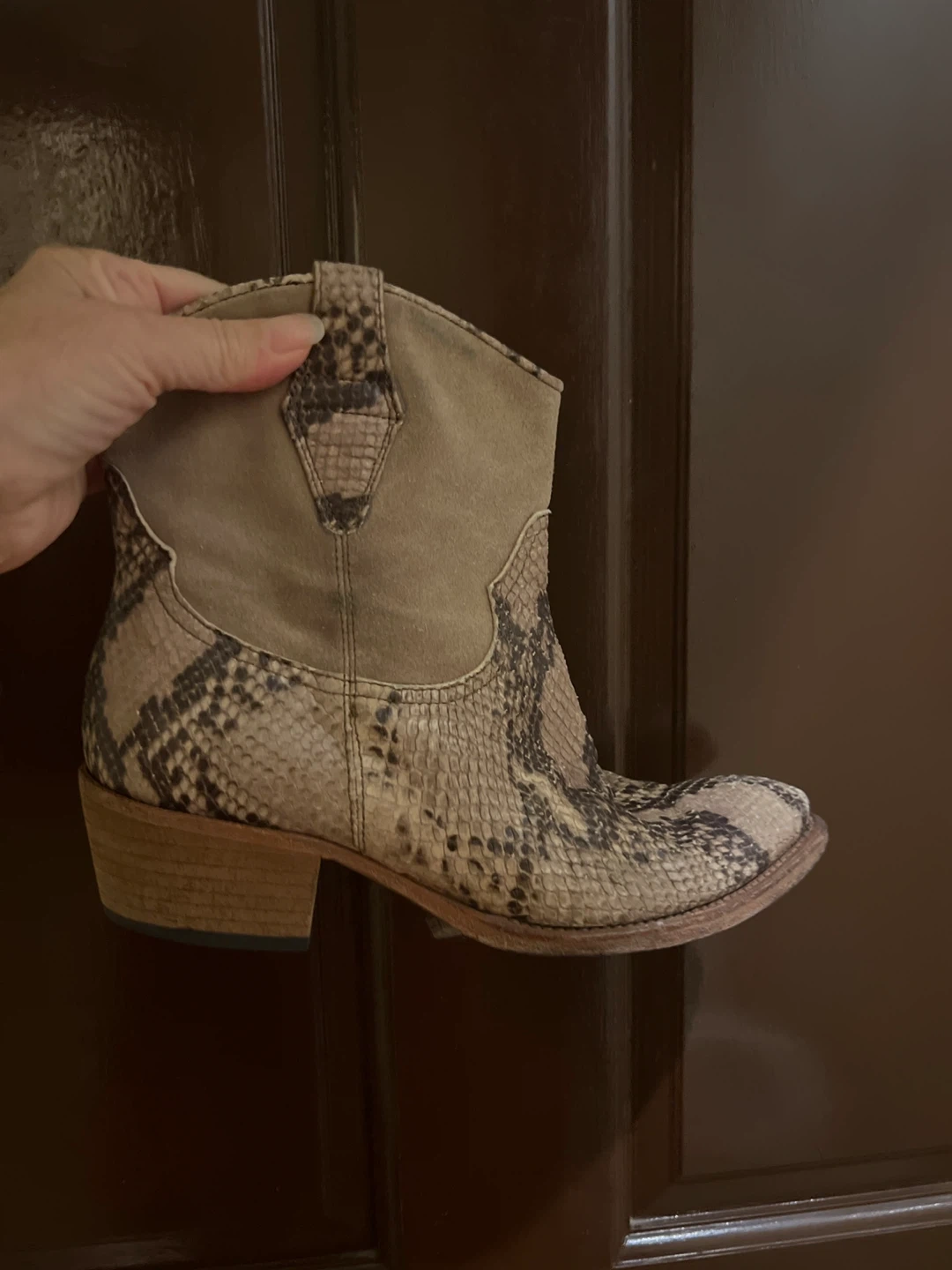 15Selling a pair of snakeskin print ankle boots in women's size 7., real leather. They have a unique design and are in good condition. Perfect for adding a touch of western style to your wardrobe!