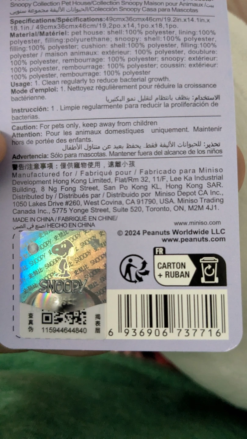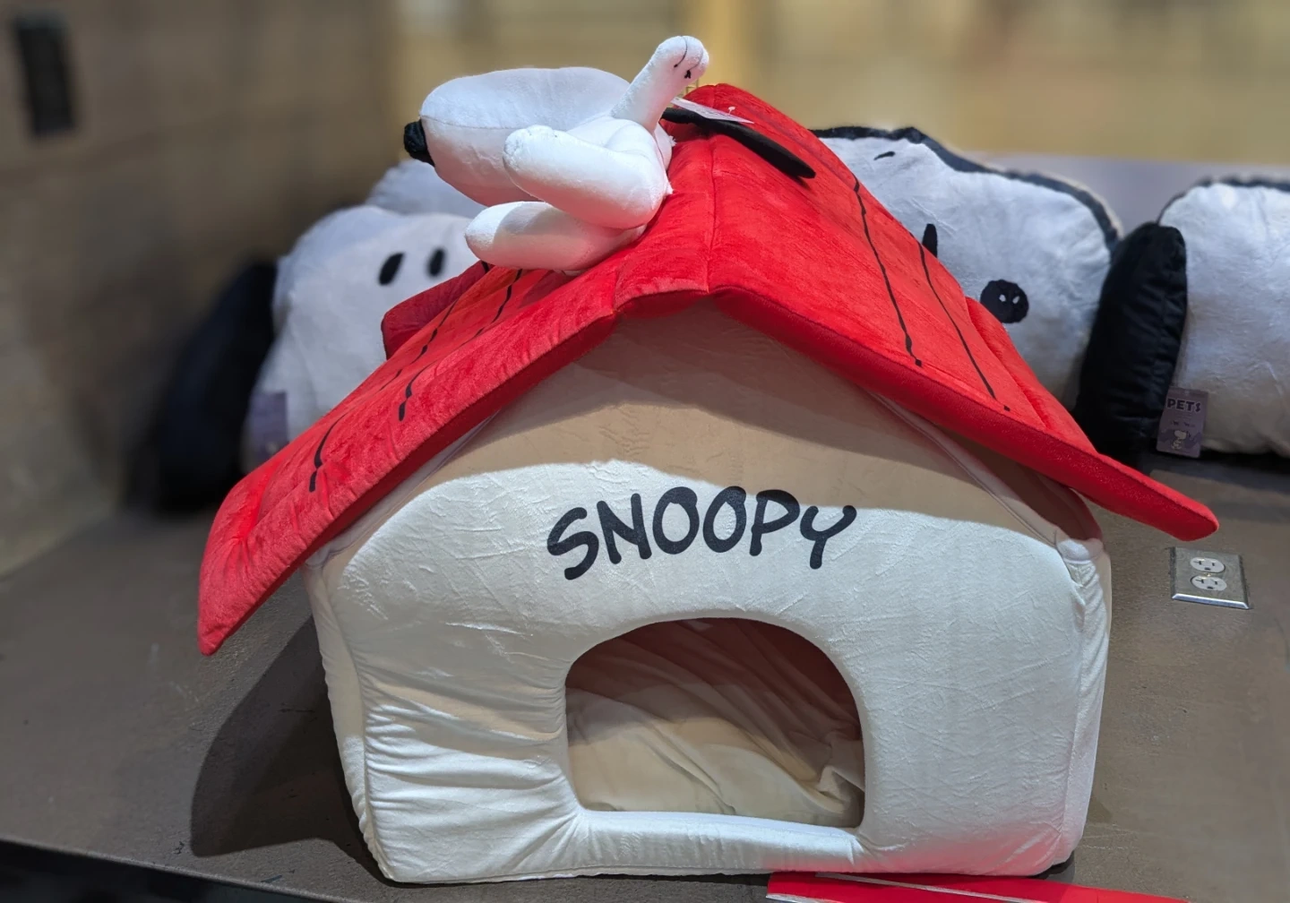130Give your furry friend a cozy Snoopy Pet House! This adorable pet house is perfect for small dogs or cats. Specifications: - Dimensions: 19.2in x 14.1in x 11.8 in (49cmx36cmx30cm) - Material: Made of 100% polyester Keep your pet comfy and stylish with this Snoopy house!
