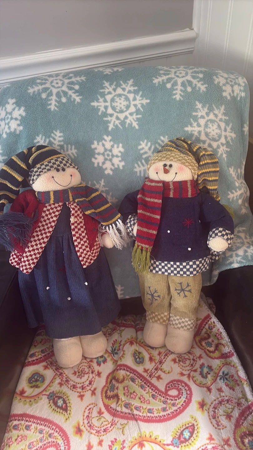 I have a set of two snowman plush decorations. They are in good condition and ready to add some winter cheer to your home!
