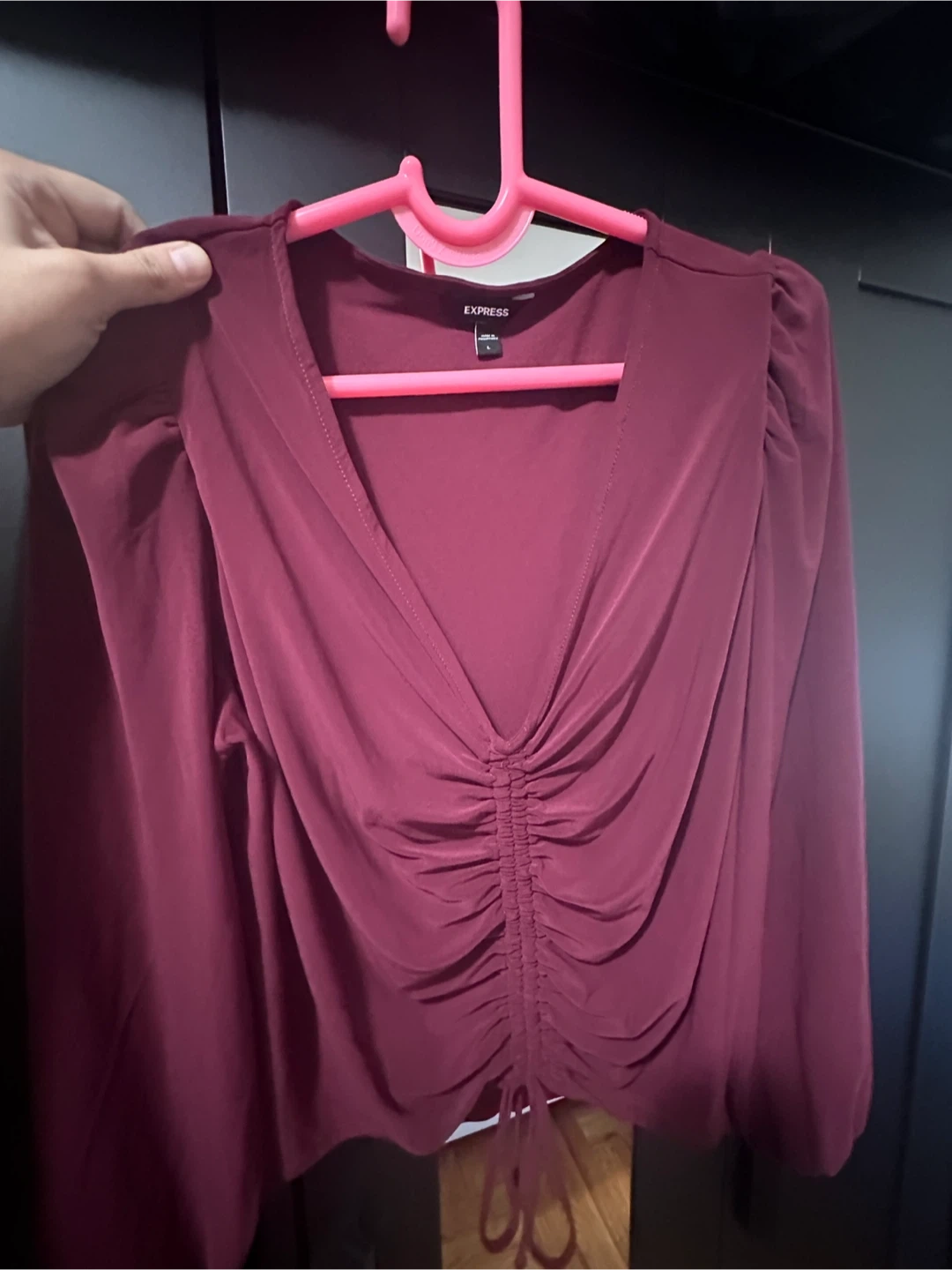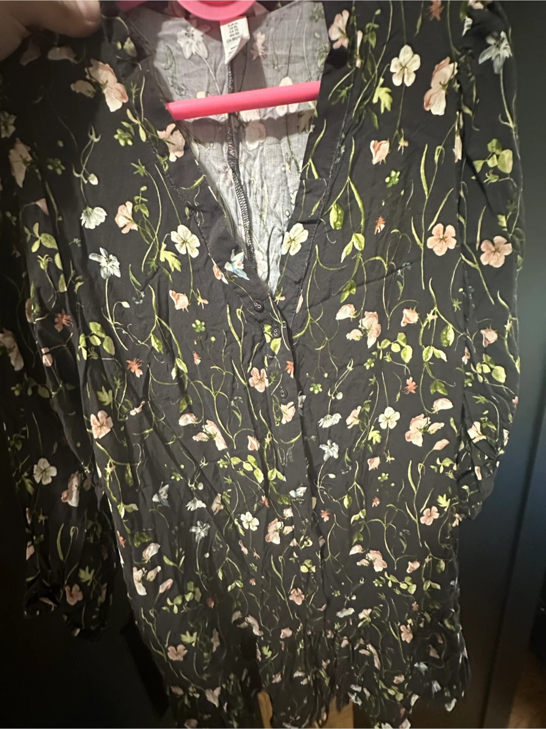 Selling a variety of women's tops and a dress. There's a floral print top, a yellow floral dress, a pair of black pants, a black button-down shirt, and a maroon top. All in good condition!