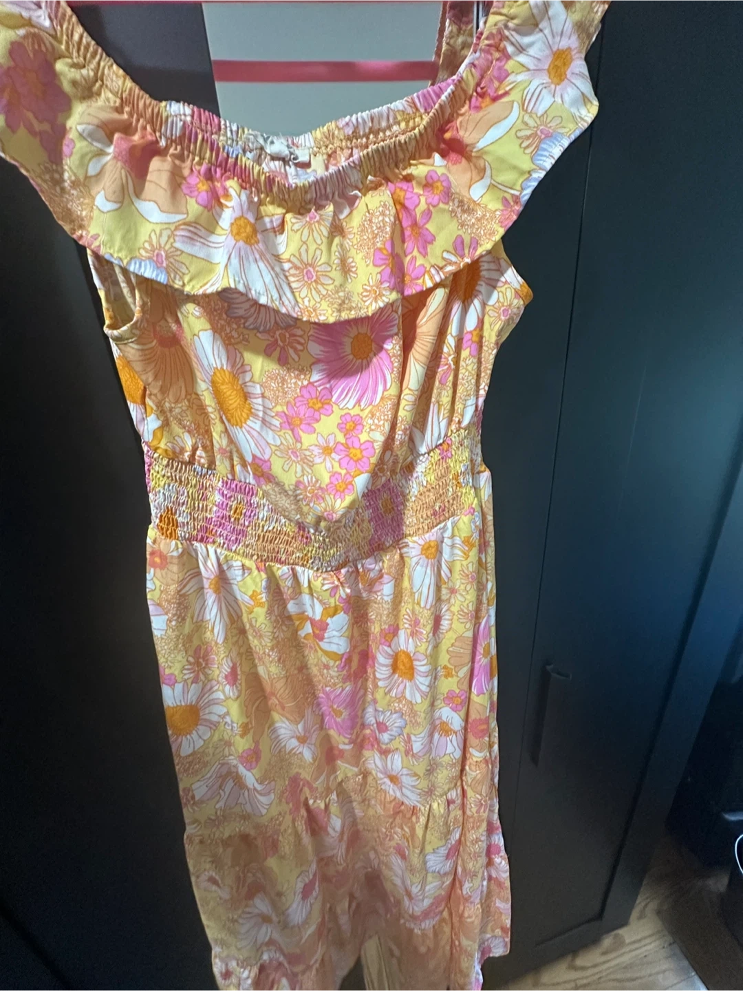 Selling a variety of women's tops and a dress. There's a floral print top, a yellow floral dress, a pair of black pants, a black button-down shirt, and a maroon top. All in good condition!