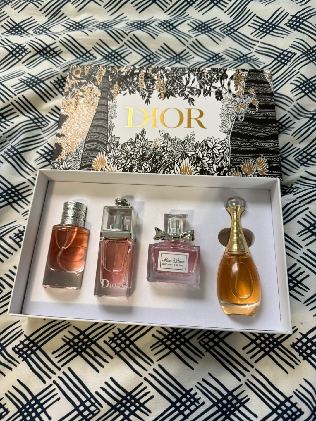 Set of four Dior mini perfumes including J'adore, Miss Dior Blooming Bouquet, Dior Addict, and Joy by Dior. Each bottle contains 1.02 fl. oz. of Eau de Parfum. Made in France. Going for 125$ great prices follow the instagram royalty4cheap