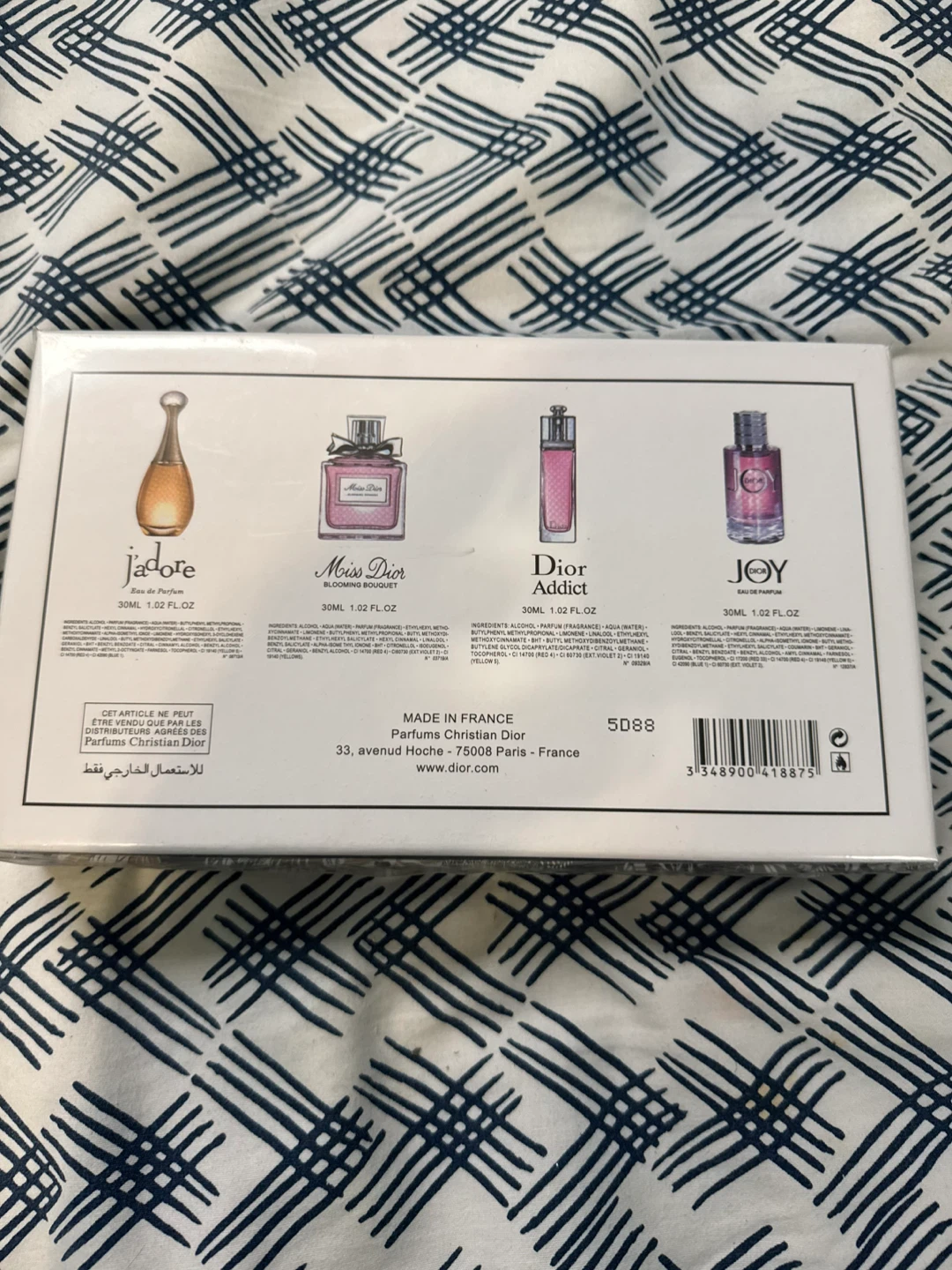 Set of four Dior mini perfumes including J'adore, Miss Dior Blooming Bouquet, Dior Addict, and Joy by Dior. Each bottle contains 1.02 fl. oz. of Eau de Parfum. Made in France. Going for 125$ great prices follow the instagram royalty4cheap