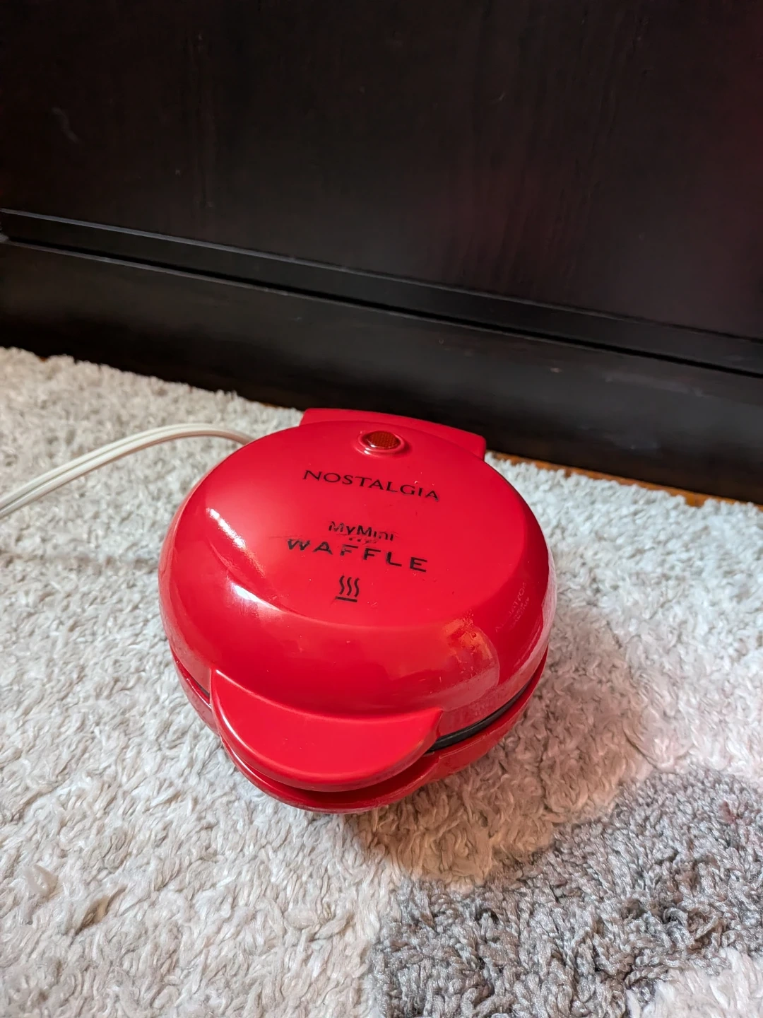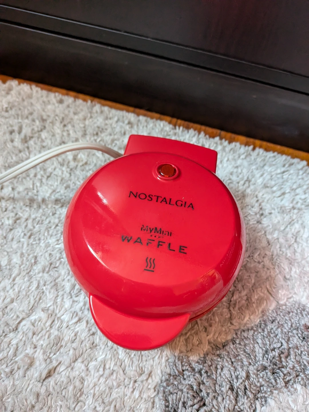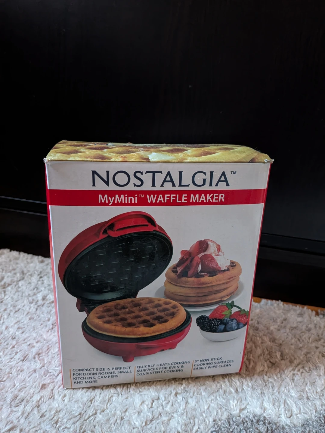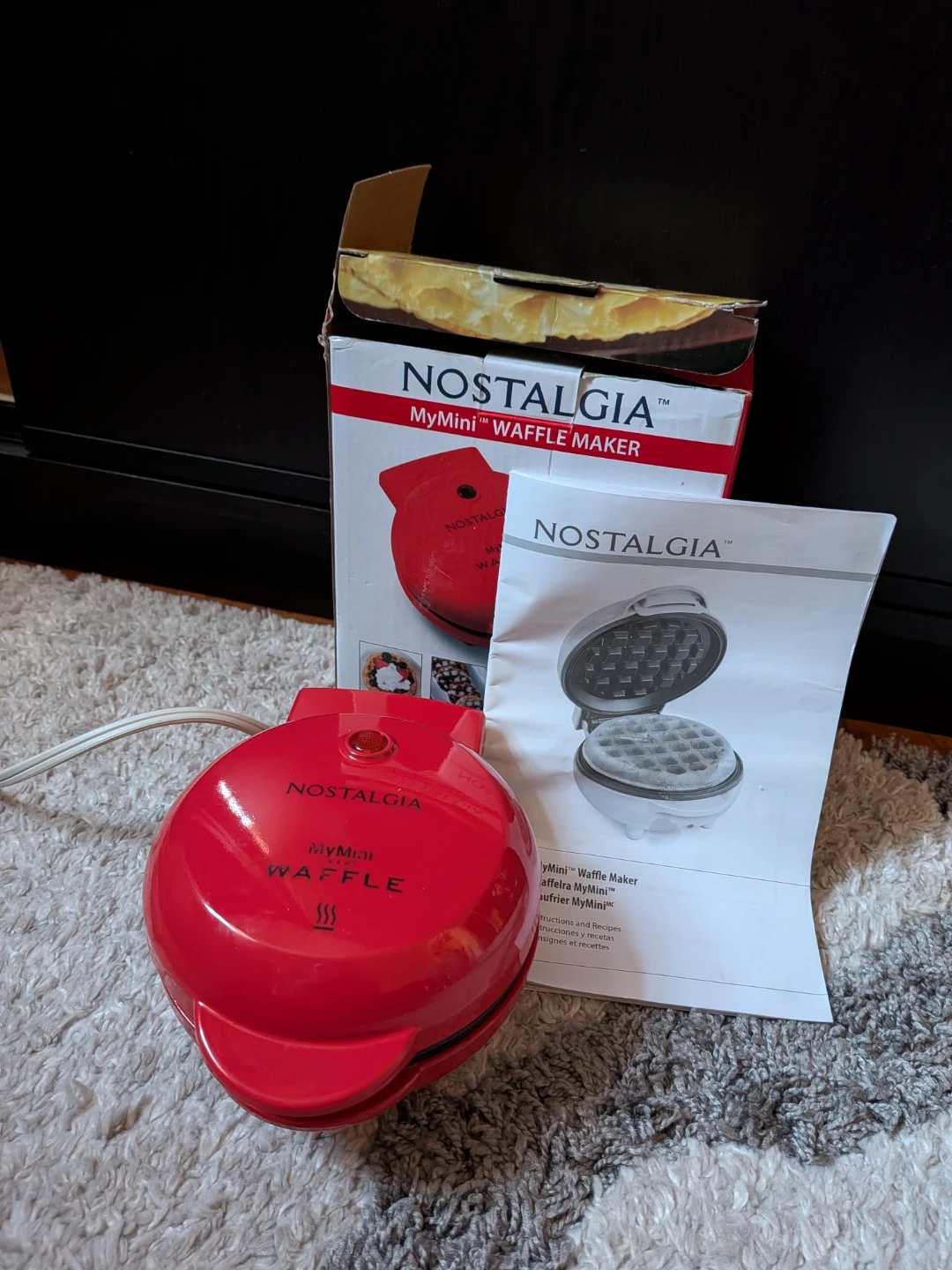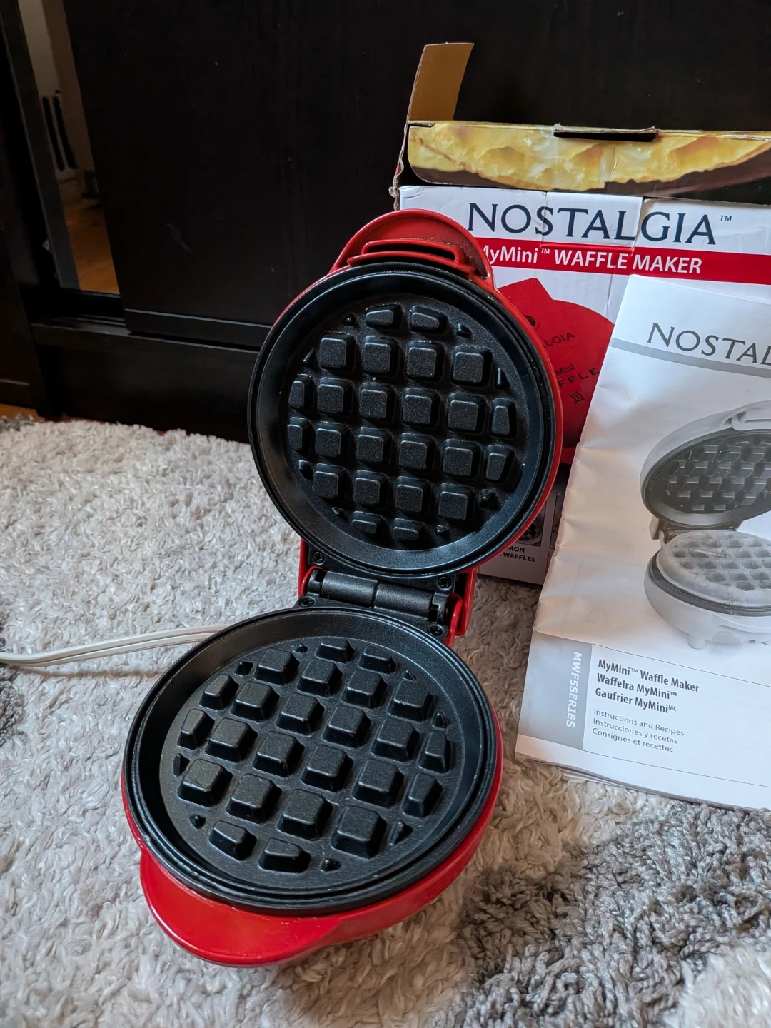 This is a red Nostalgia MyMini Waffle Maker. It includes the original box and instructions. Non-stick cooking surfaces make it easy to clean.