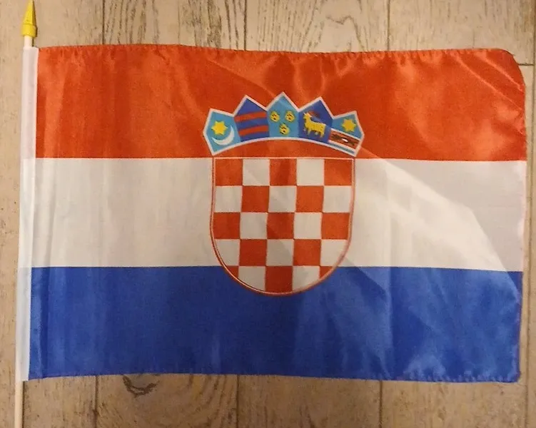 Small handheld flag of Croatia. Features the red and white checkerboard shield topped with crowns and the crest. It's made of fabric and attached to a white plastic pole with a yellow tip.