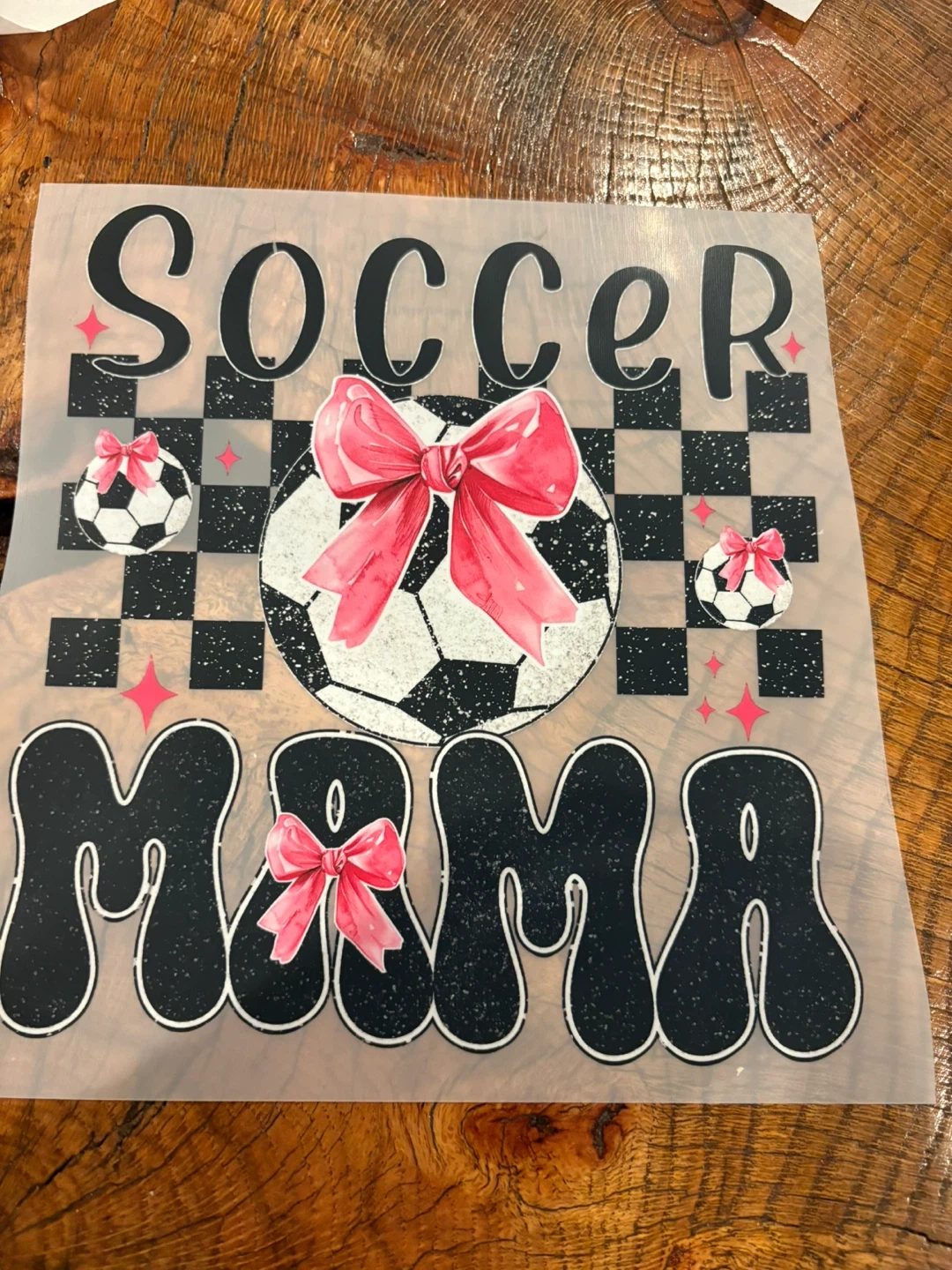 Cute soccer mama graphic print with a soccer ball and pink bow design