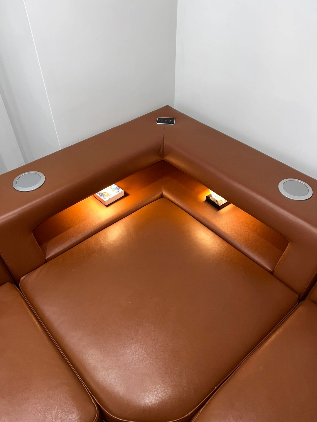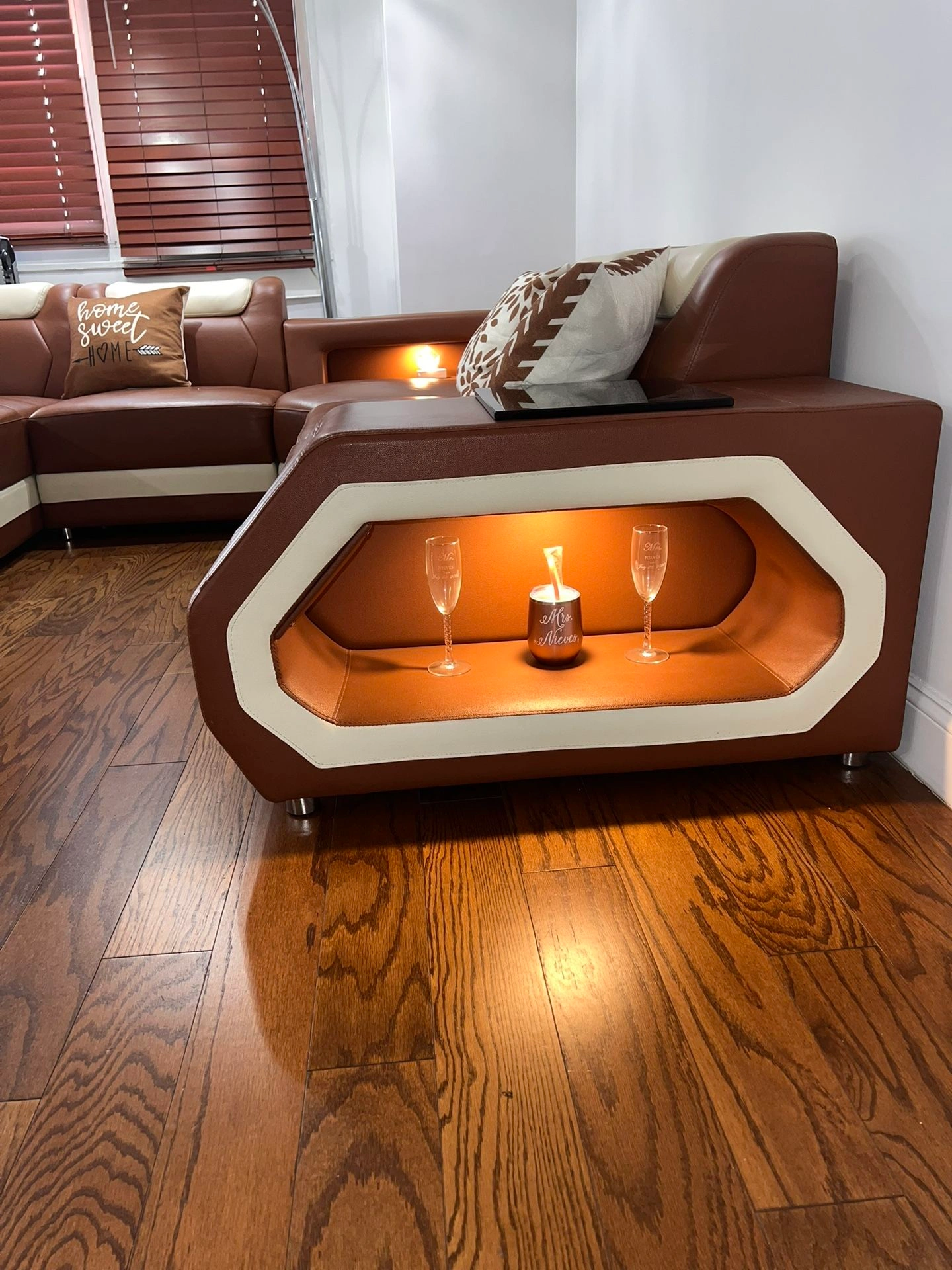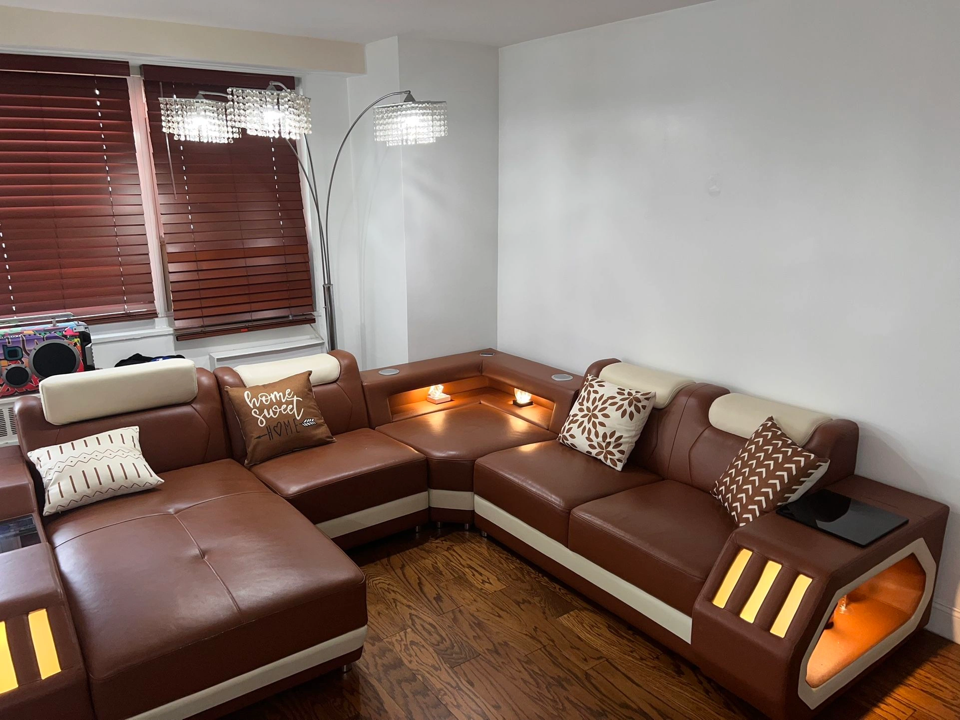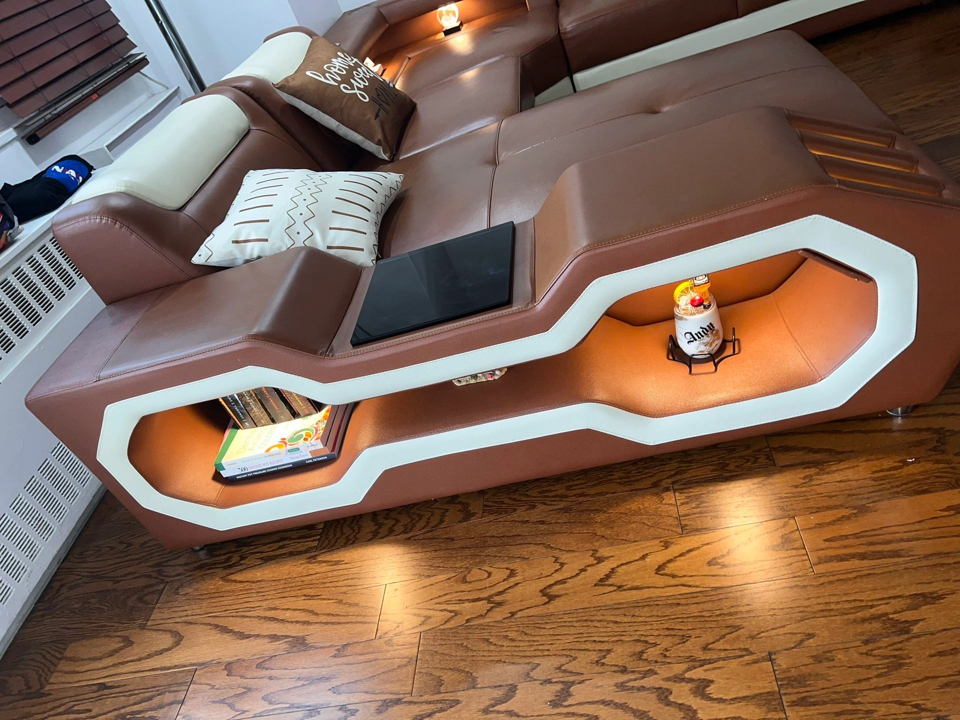 Shoot me an offer! Custom made leather sofa lounge couches. Brown and off white with Bluetooth speakers, LED lighting. Shelf’s with lighting. Foldable headrest and usb input. Paid $4500. Condition 8/10. The lights used to be blue I changed them to warm white. U can buy and change the lights colors any color u want I can show u how to install. Pick up in the Bronx. Name brand it’s Sofadream look it up.