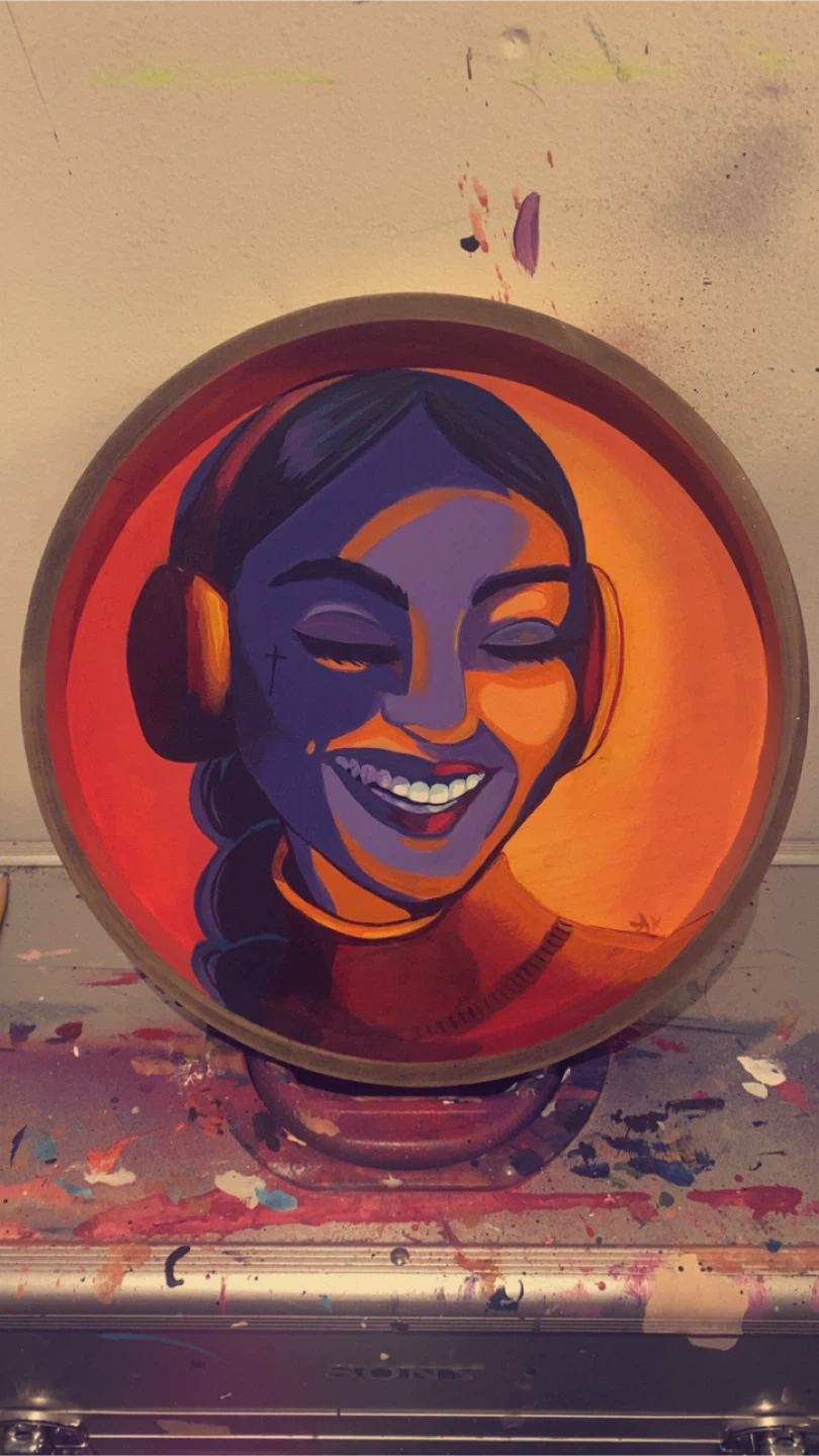 Hand-painted round wood surface featuring a vibrant portrait of a woman wearing headphones. The artwork uses bold colors and abstract shading for a modern look. This piece is ready to hang and would be a colorful addition to any space! 12x12