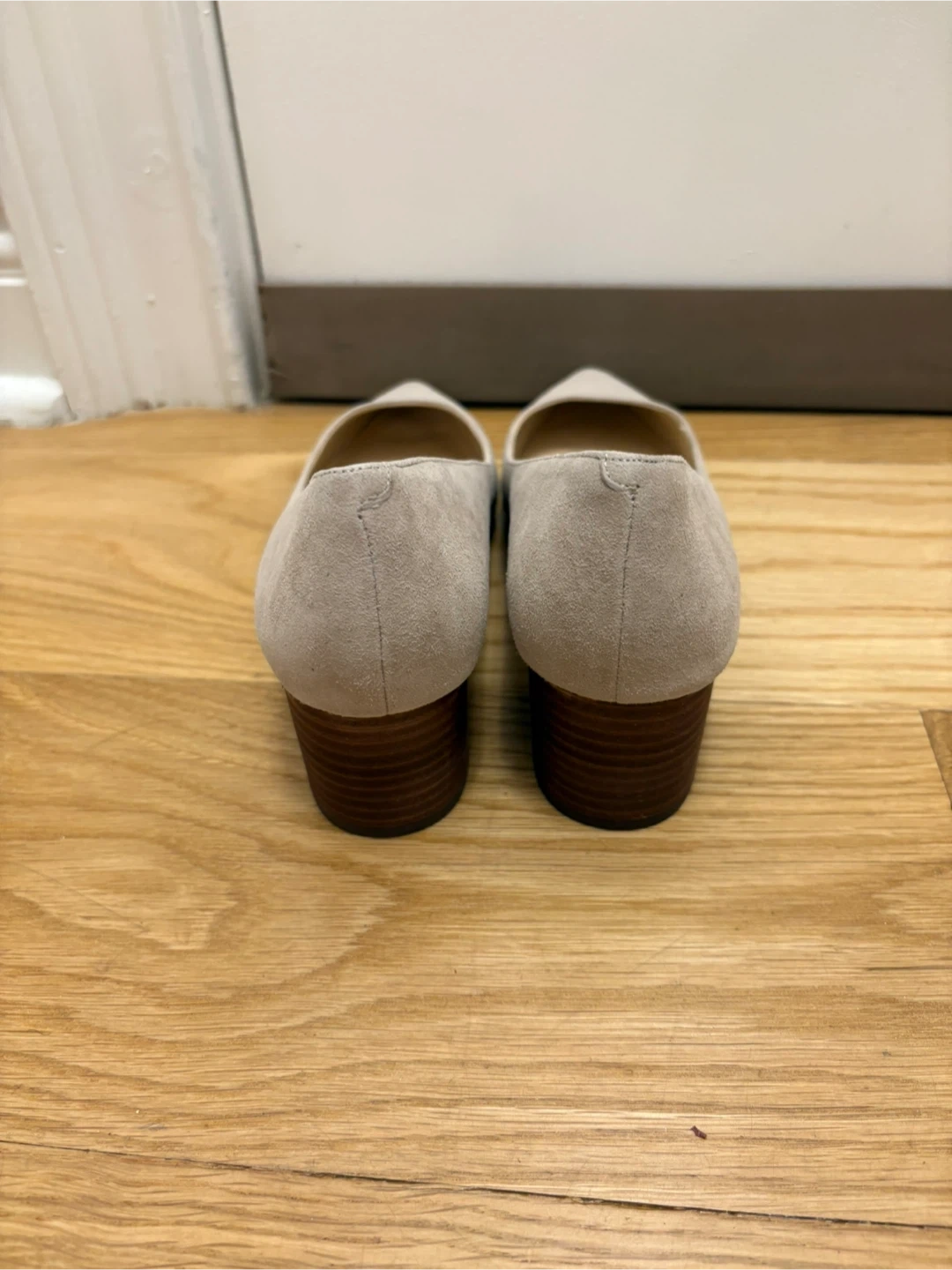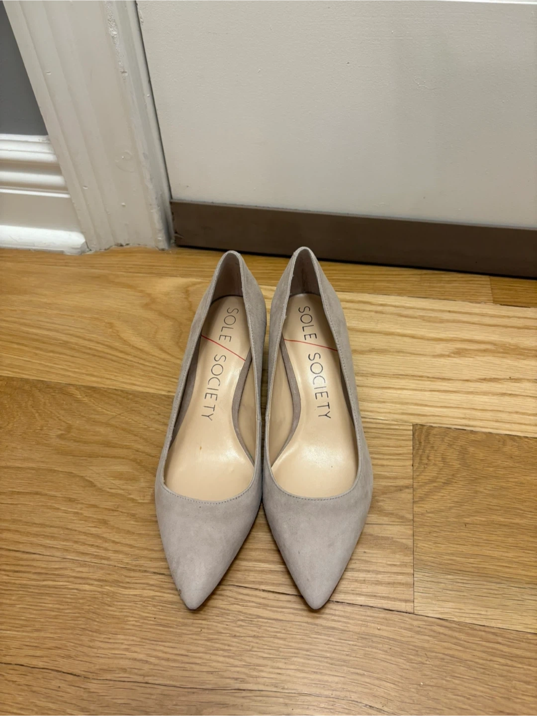 Selling a pair of Sole Society heels in a beautiful beige suede! These are perfect for dressing up or down. They have a comfortable block heel and are in great condition