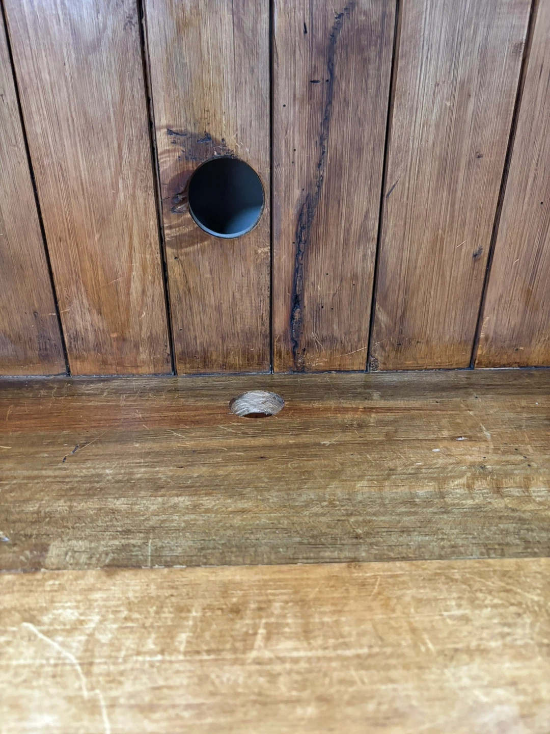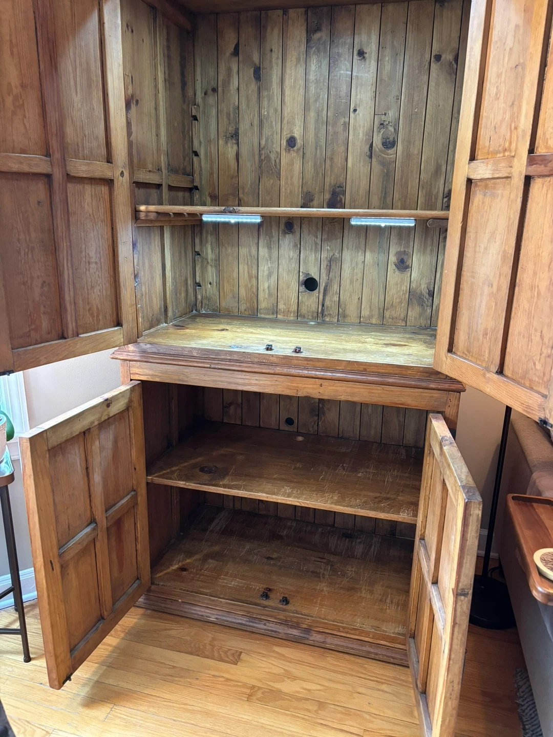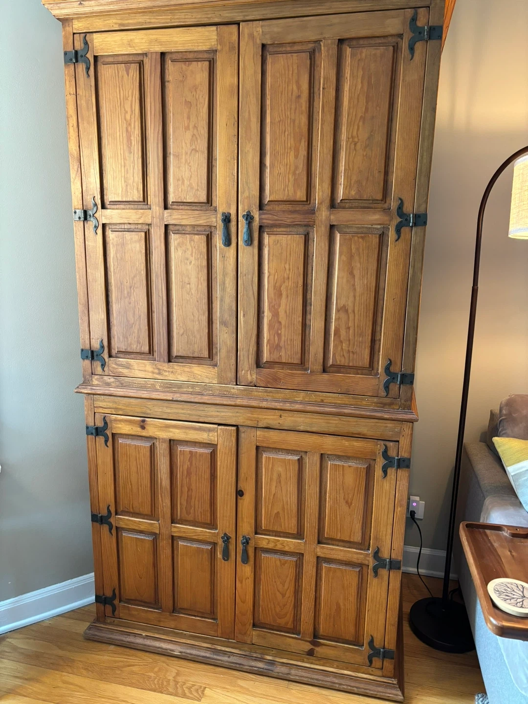 Beautiful solid pine armoire. Handmade and purchased in Chicago at Pino Viejo. 80 inches tall X 40 inches wide X 24 inches deep Used as a media cabinet, later as a china, liquor cabinet… held a 40 inch Sony Bravia TV Tons of storage and pre-drilled for media cords/cables on both levels. Comes apart in two pieces so easy to move but heavy as it is completely solid. You will need two people.