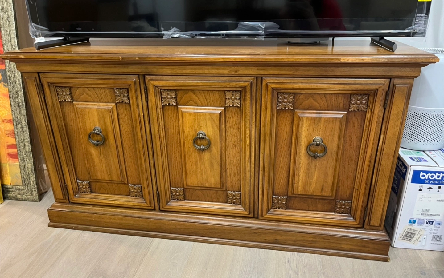 Selling a lovely solid wood TV console/cabinet! It features a classic design with three doors and ornate detailing. Perfect for adding a touch of elegance to your living room or entertainment area. 55 inches wide. Slight signs of wear.