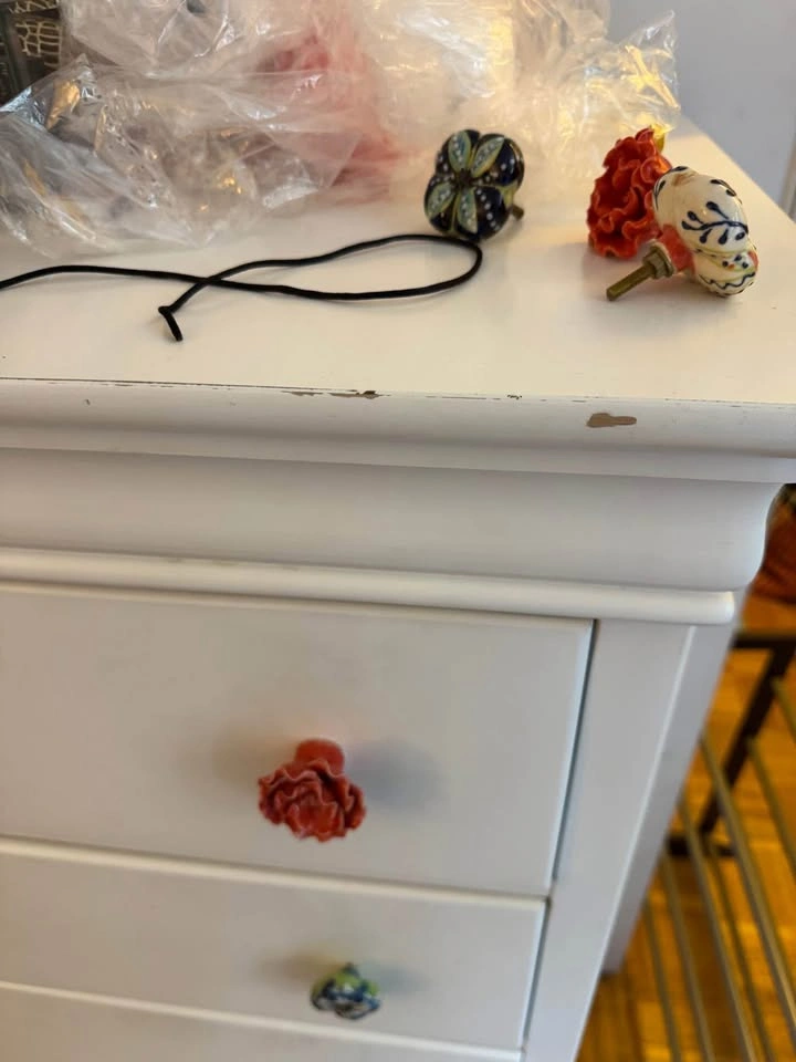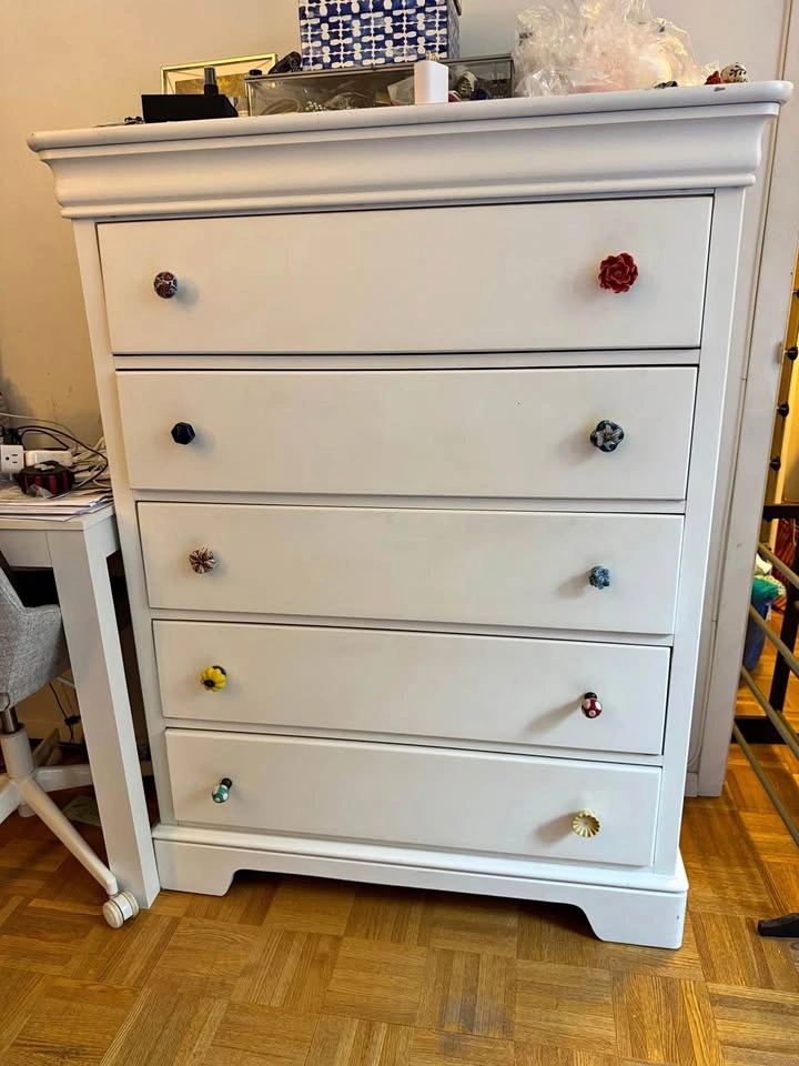 15Solid white wood pottery barn dresser. 38 wide 16.5 deep, 51.5 tall. Knobs will be replaced with plain white ones. Originally over $1000 piece but some scuffing and drawers need the stop mechanism repaired so selling for a bargain. Elevator building, we will bring it down for you. Pickup September upper west side