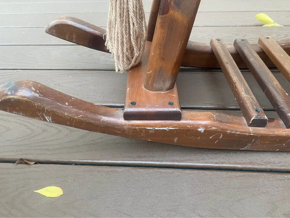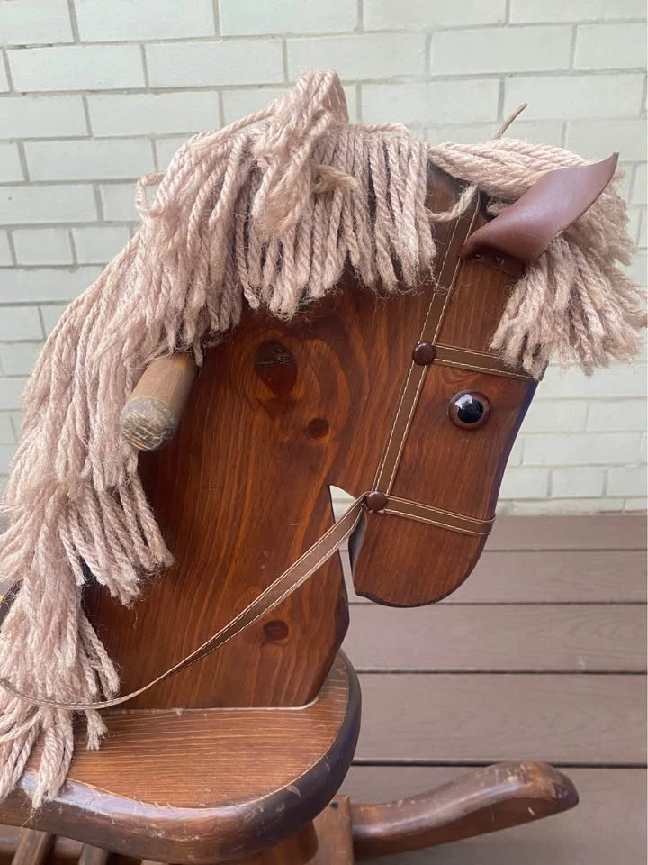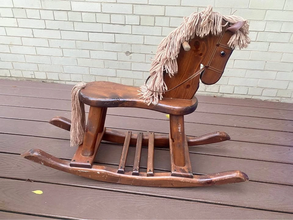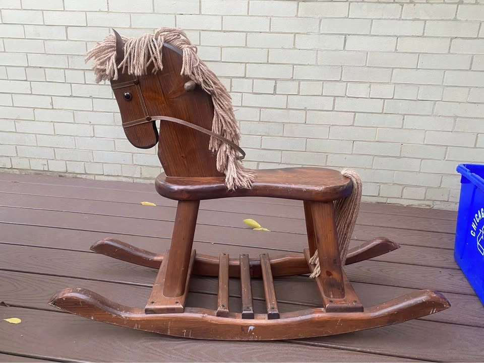 125Measures 35" long and 27ā tall at top of horseās head. This is an extremely well-made, very sturdy rocking horse that is a classically adorable heirloom piece. Non-smoking home. There are scratches, please see pictures. Could easily be refinished. This rocking horse is 30 years old. Pick up near 107th & Hoyne.