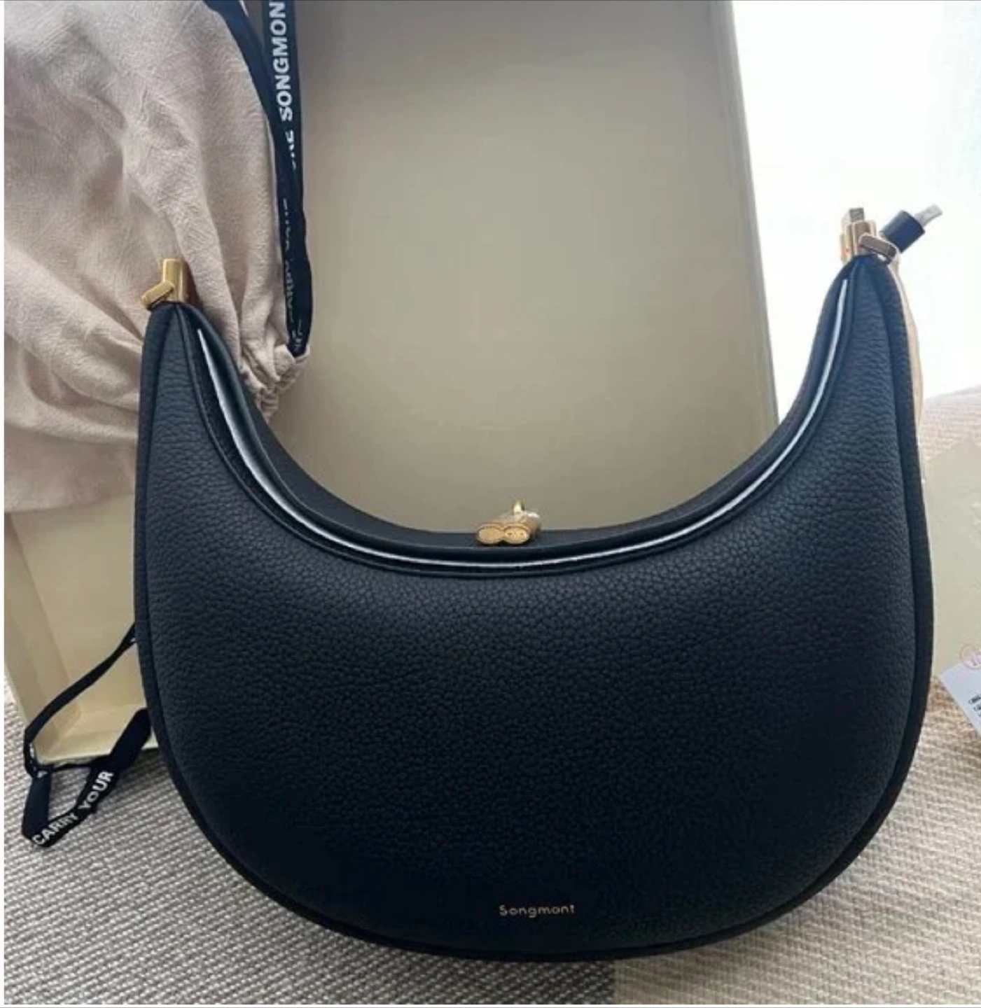 31Mid-Luxury, very trendy bag. Black leather half-moon shaped handbag. Gold hardware accents. Comes with dust bag. New never used. Songmont daisy charm included.