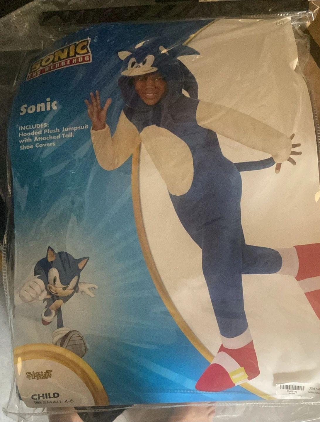 60Selling a Sonic the Hedgehog child's costume! It's a size Small (4-6) and includes a hooded plush jumpsuit with an attached tail and shoe covers