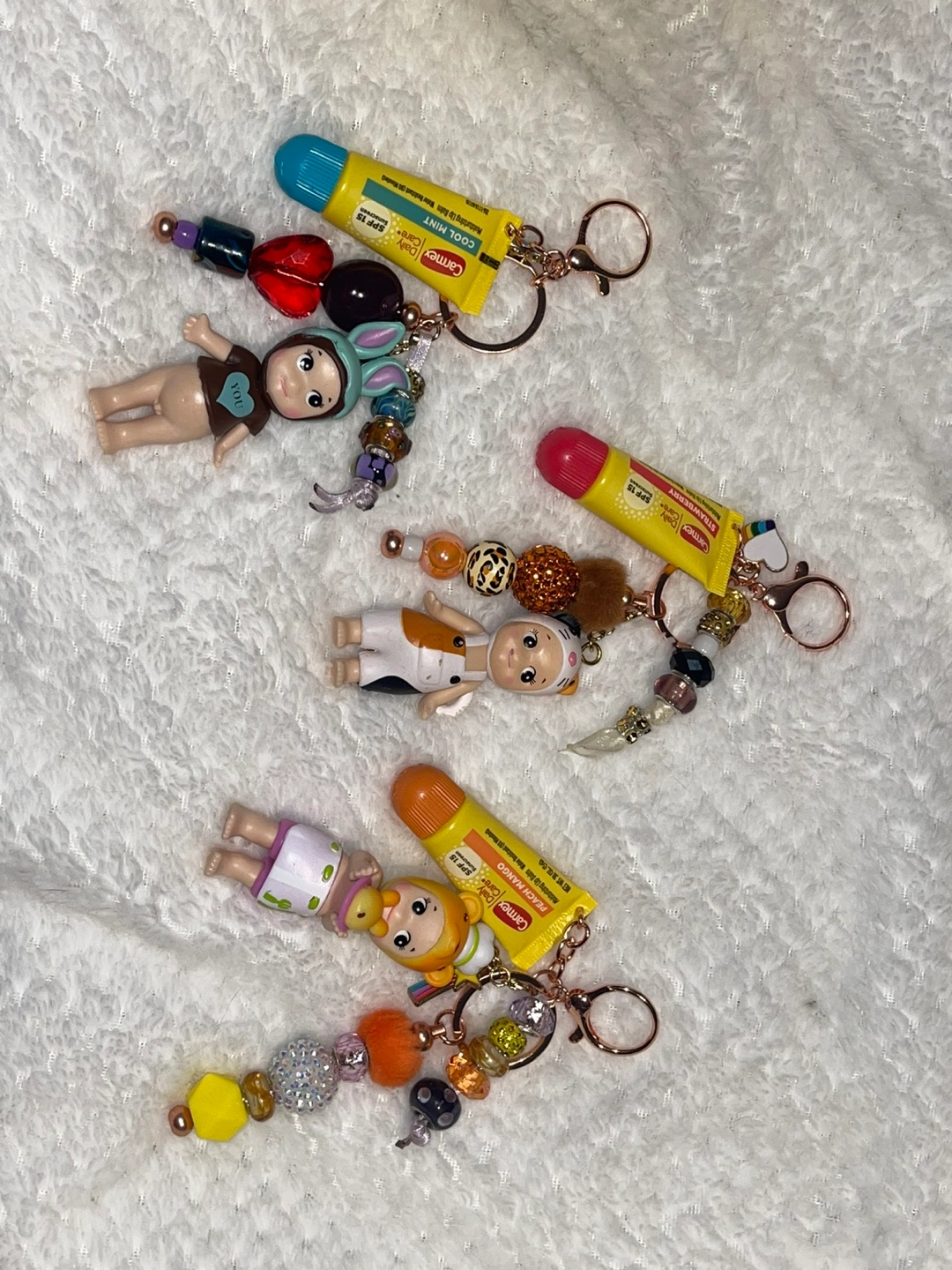 Check out these adorable Carmex lip balm keychains! Each one features a different flavor of Carmex lip balm (Peach Mango, Strawberry, and Cool Mint) attached to a fun and unique beaded keychain with a cute little doll charm. Perfect for adding a touch of fun to your keys or bag while keeping your lips moisturized! $12 each