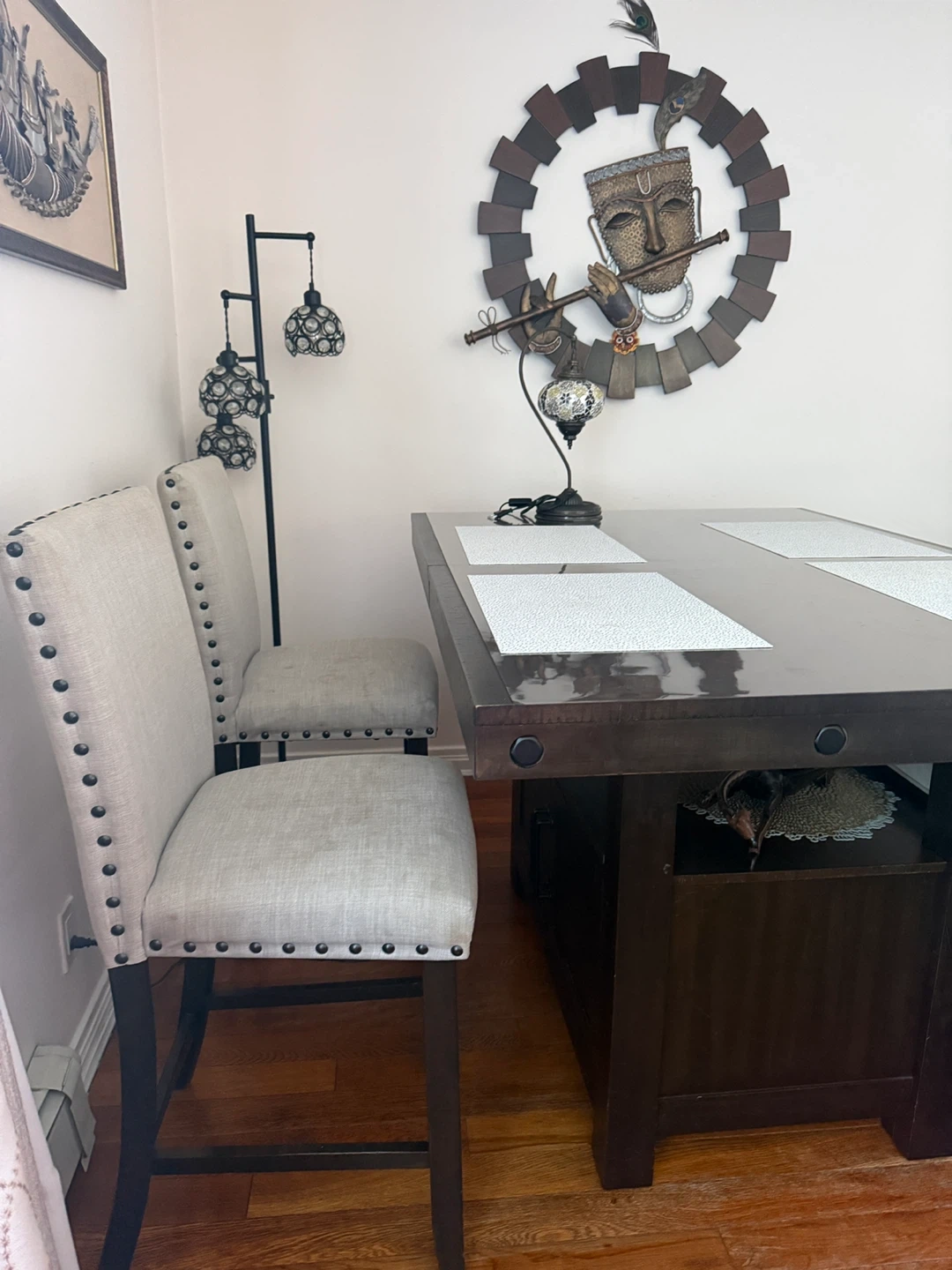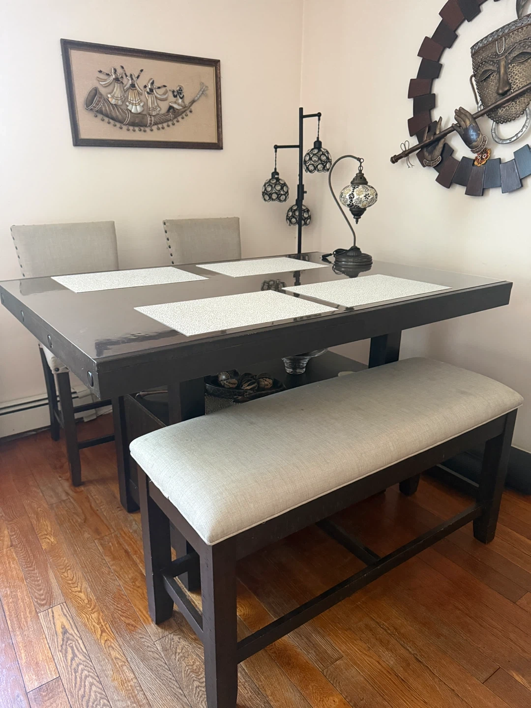 This counter table has classic hardware and a charming natural finish.It also has something that not many dining tables have, and that's storage right underneath.you'll be able to fit in more of the family by extending the length of the table from 60" to 80" in a flash.