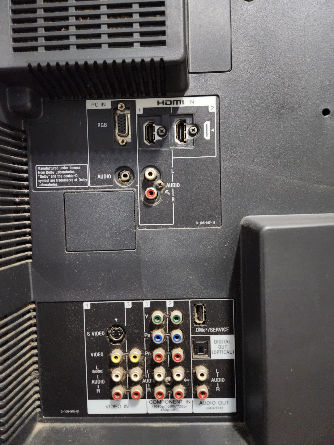 ***Pick up by this Sunday*** 46-inch LCD Sony Bravia TV. Multiple inputs including HDMI and component. Made in Mexico. Includes Universal remote. *It has burn spots in the screen, and one of the HDMI inputs don't work. But, it can still be used and fixed if wanted. It can function as a CPU Monitor. (All as shown above.)
