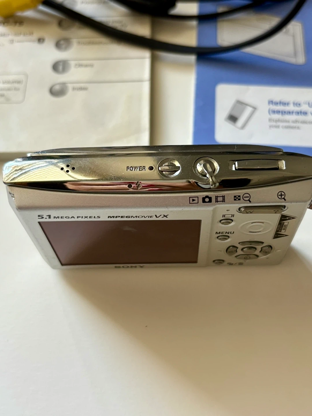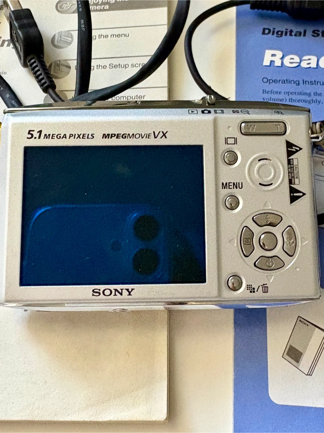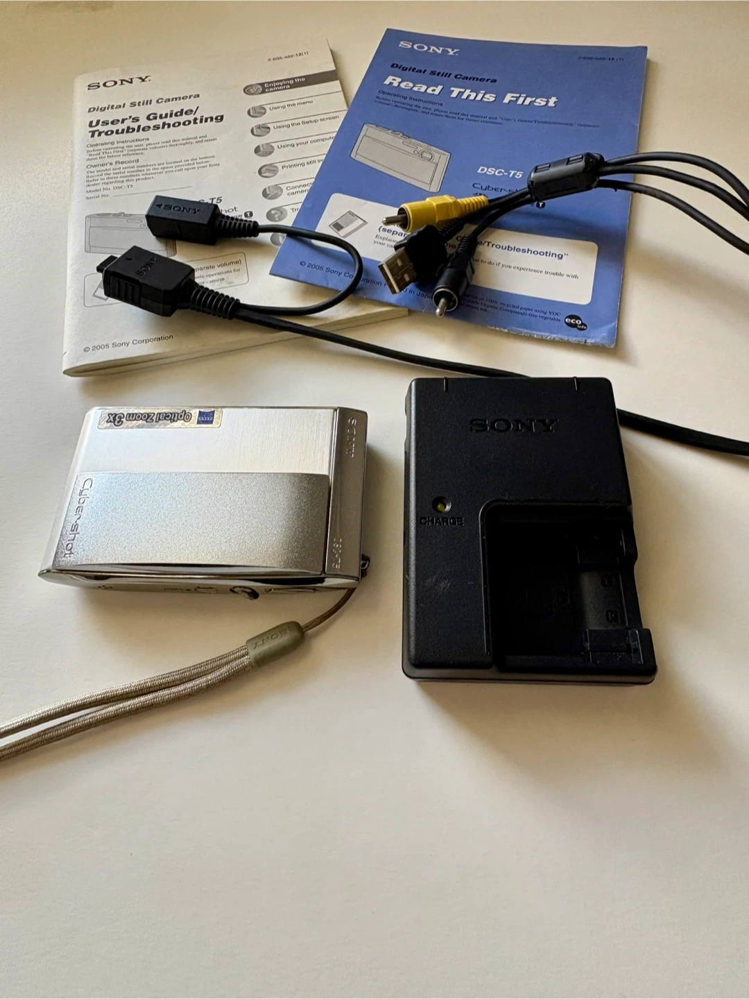 Sony Cybershot Digital Camera in working condition and comes with battery charger BC-CS3; rechargeable battery pack NP-FT1; USB, A/V,DC IN cable for multi-use terminal, Wrist Strap, CD-ROM (cyber-shot application software) , quick guide/ operating instructions and User Guide booklet. All of the above captured in photos. Camera is silver color in great condition ;no scratches.