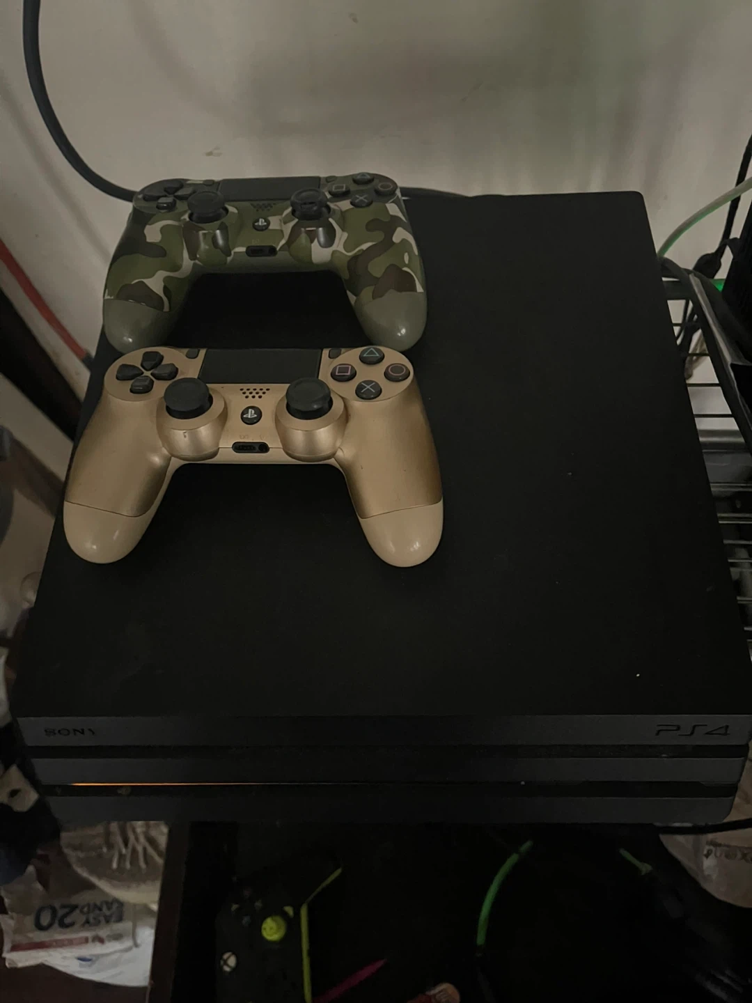 14Selling a used Sony PS4 Pro console. It comes with two controllers, one in gold and one in a camo design. Great for gaming!