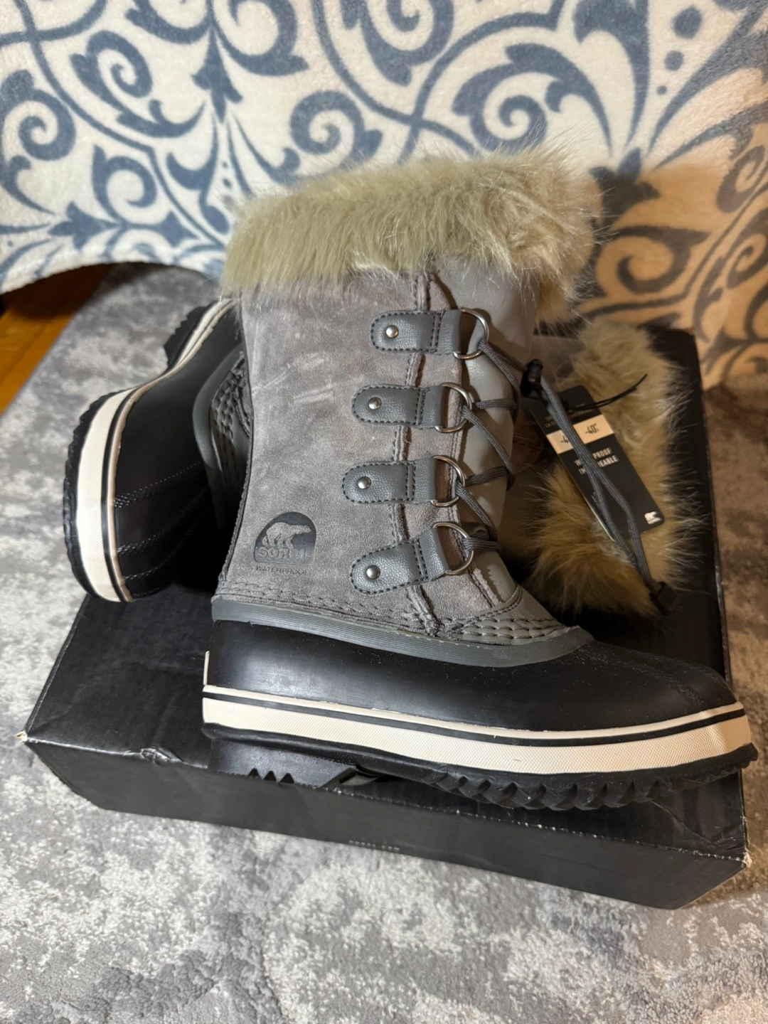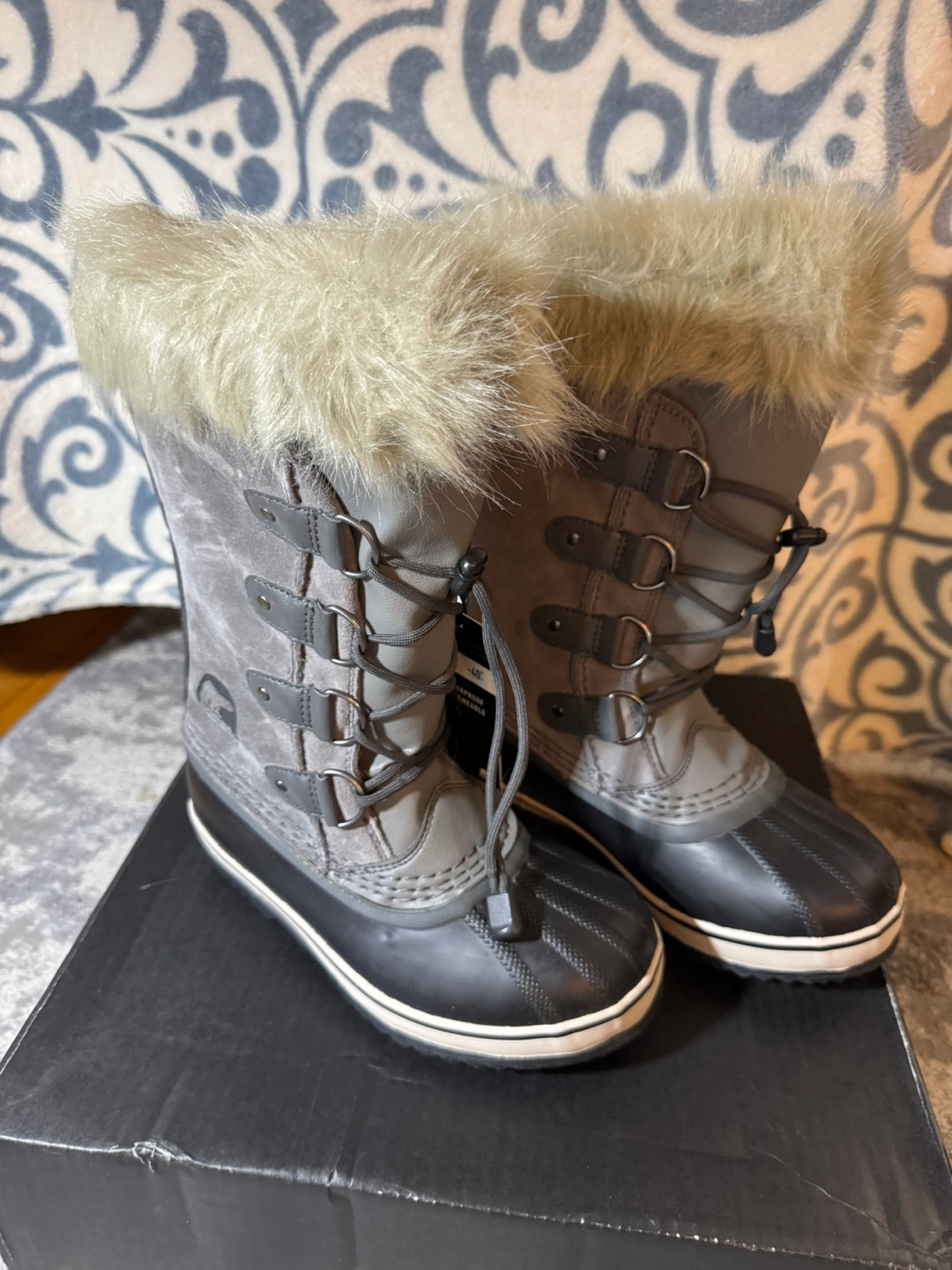These are a pair of Sorel Joan of Arctic Wedge II boots in gray. They come with the original box. These boots are perfect for cold and snowy weather!