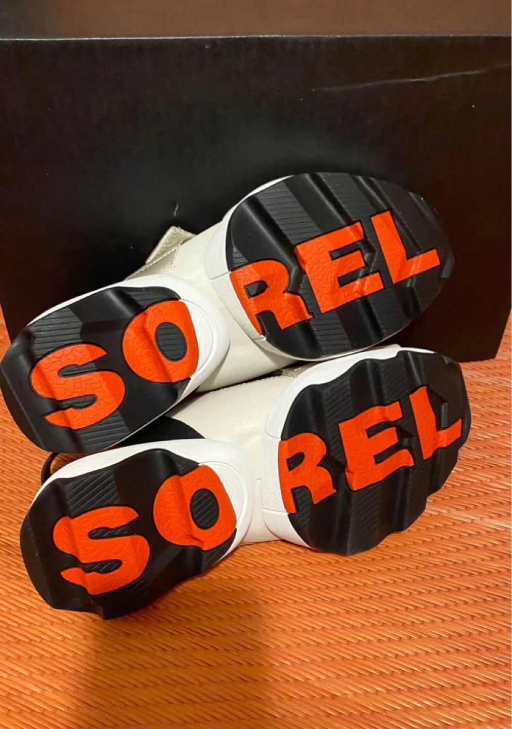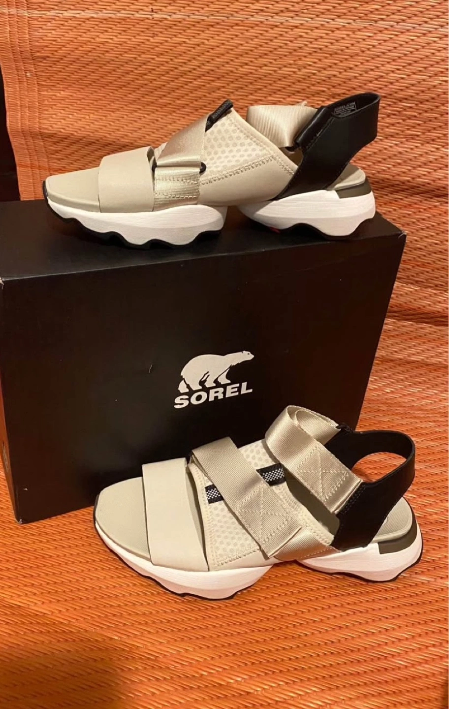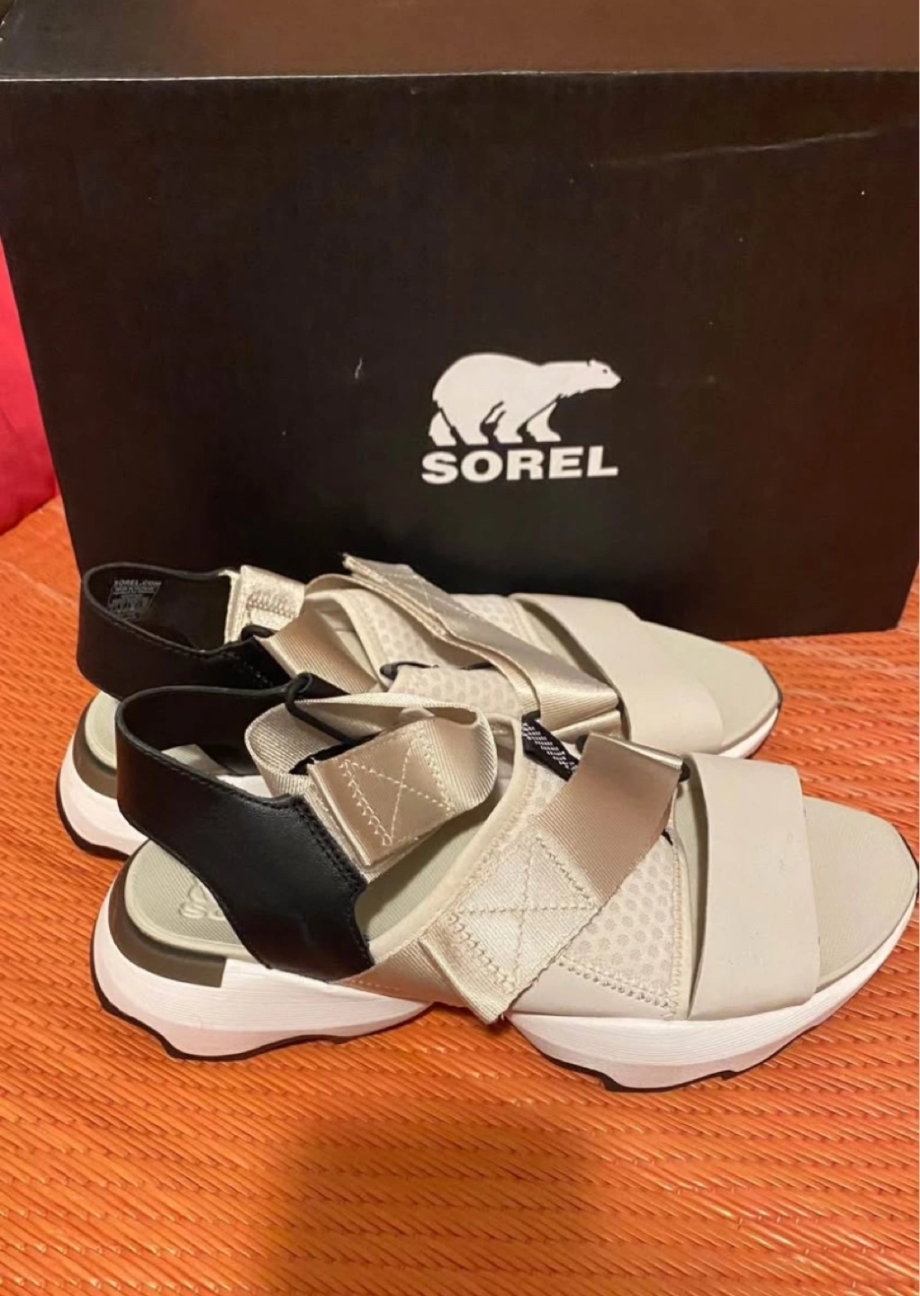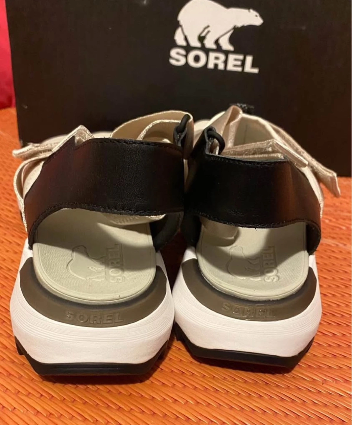 Brand new SOREL women's sandals. Beige and black. Chunky sole. Adjustable straps. Comes in original box.