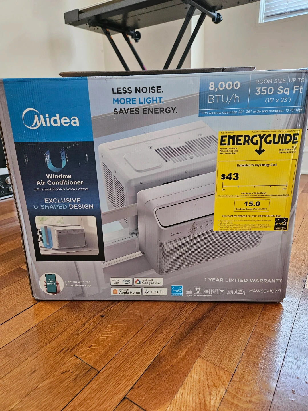 Midea window air conditioner with 8,000 BTU capacity. Fits rooms up to 350 Sq Ft and window openings 22"-36" wide.