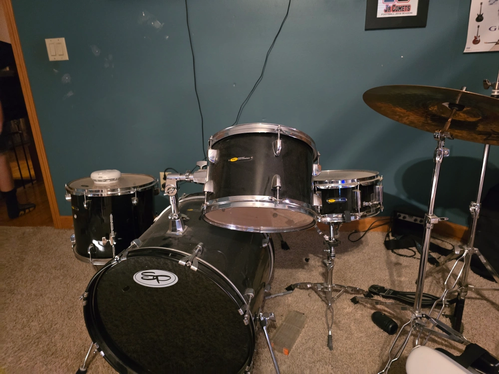 Selling a used Sound Percussion drum set in black. It includes a snare drum, bass drum, tom drums, and cymbal. Great for beginners or anyone looking for a complete set!