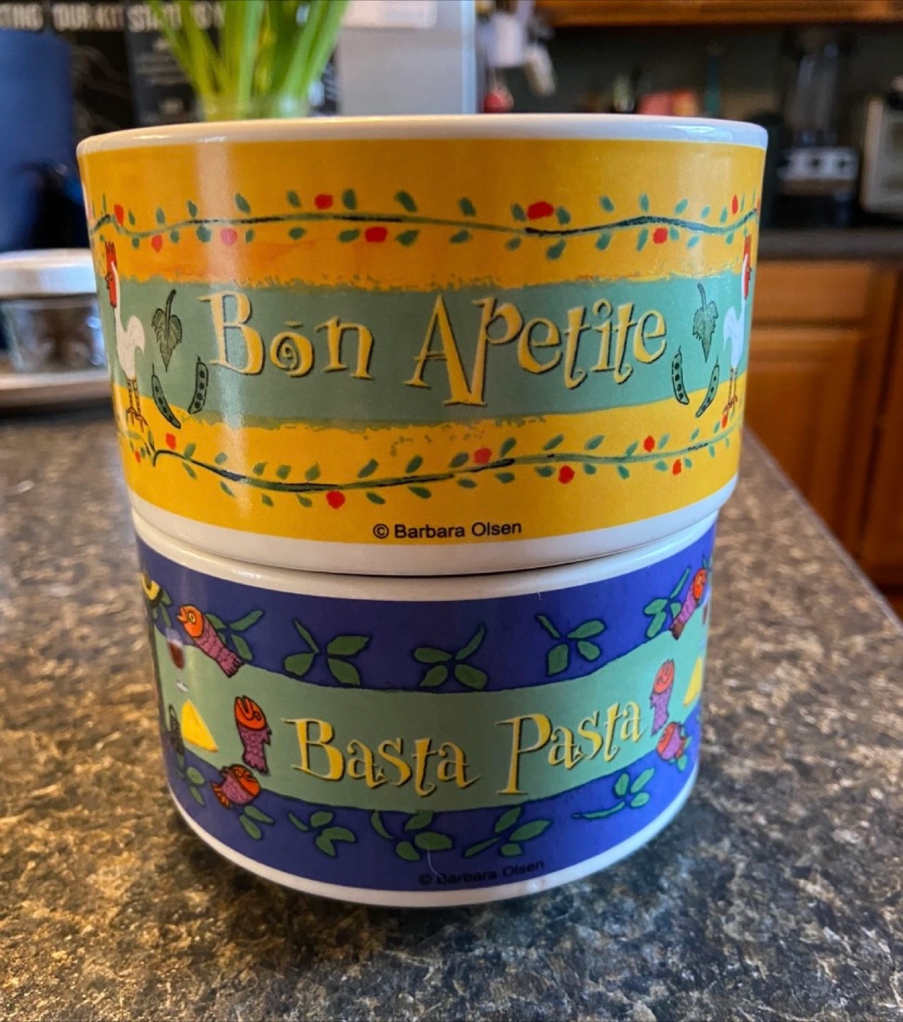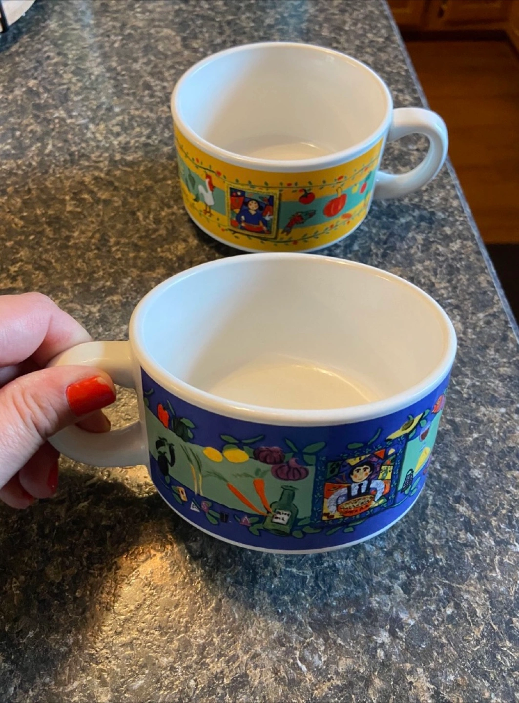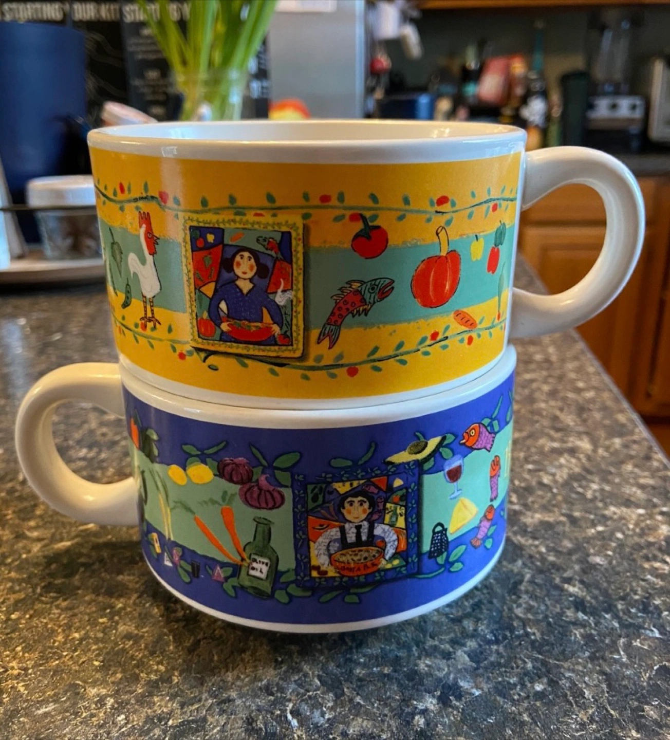 Two cute soup mugs designed by Barbara Olsen. Each mug holds about 2cups Microwave & dishwasher safe