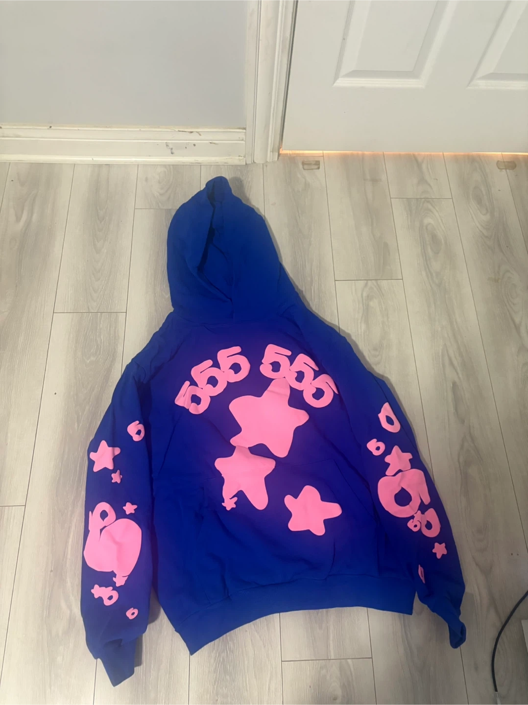 Selling a Sp5der blue hoodie with pink graphic designs. It's made of 80% cotton and 20% polyester. The graphic includes stars and the number 555555.