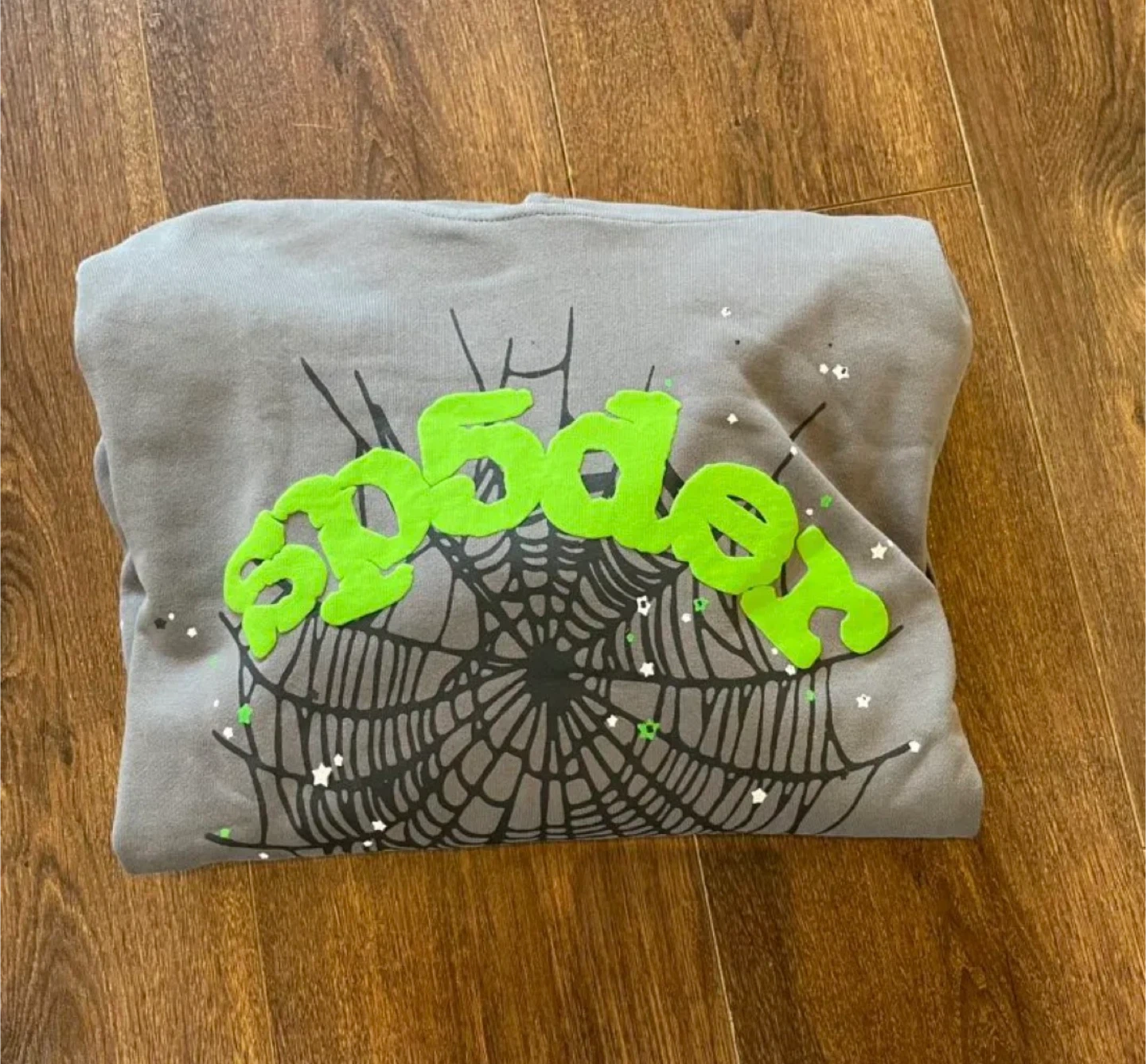 10Selling a gray hoodie with a Sp5der design! It features a spiderweb graphic and the word "Sp5der" in green lettering. It's in good condition Takes 1-2 weeks to arrive