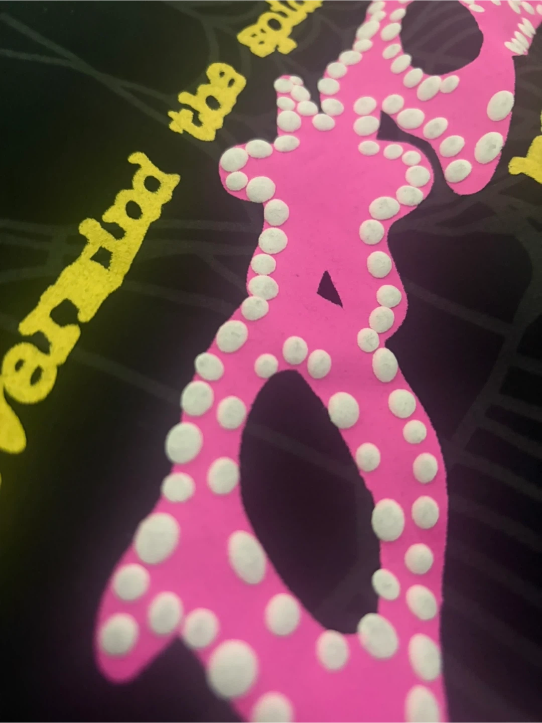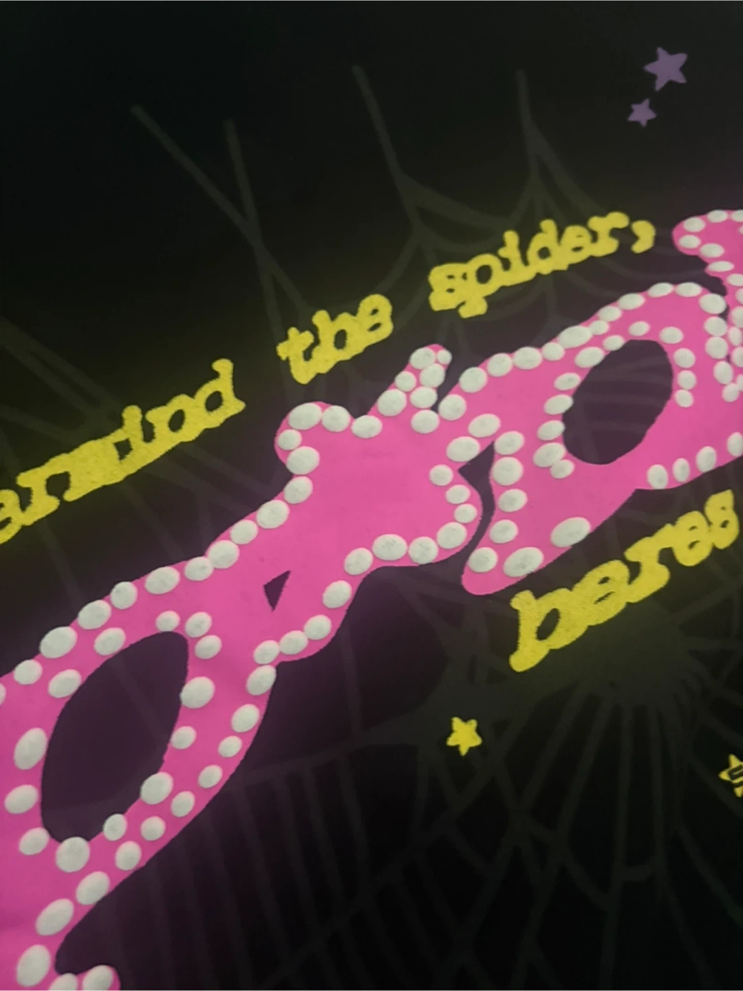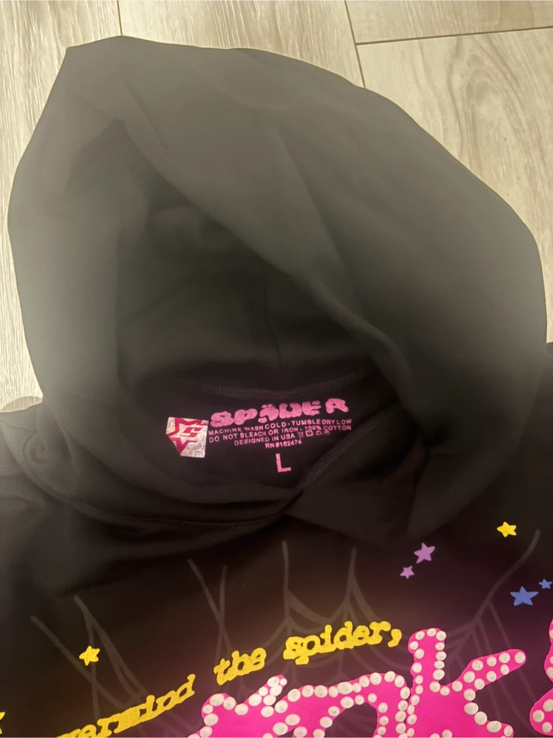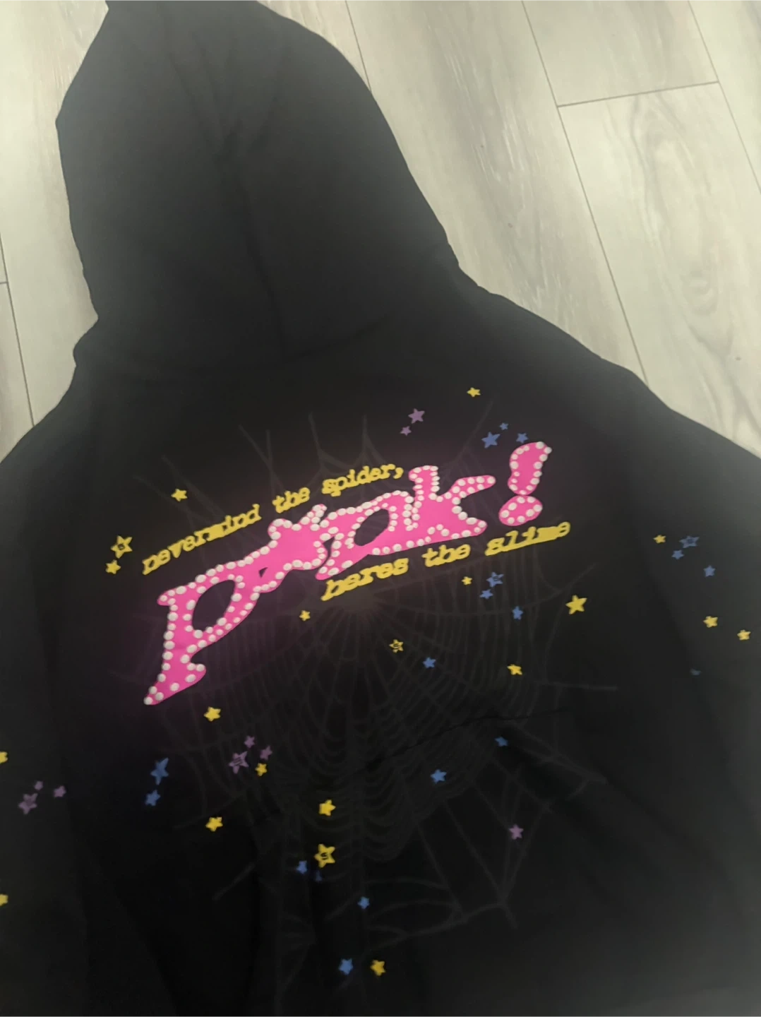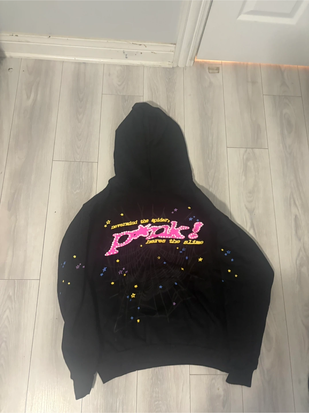 Selling a black SP5DER hoodie, size large! The design features the phrase "nevermind the spider, here's the slime" with a pink "P*nk!" logo and a spiderweb design. It's in great condition and ready for a new home