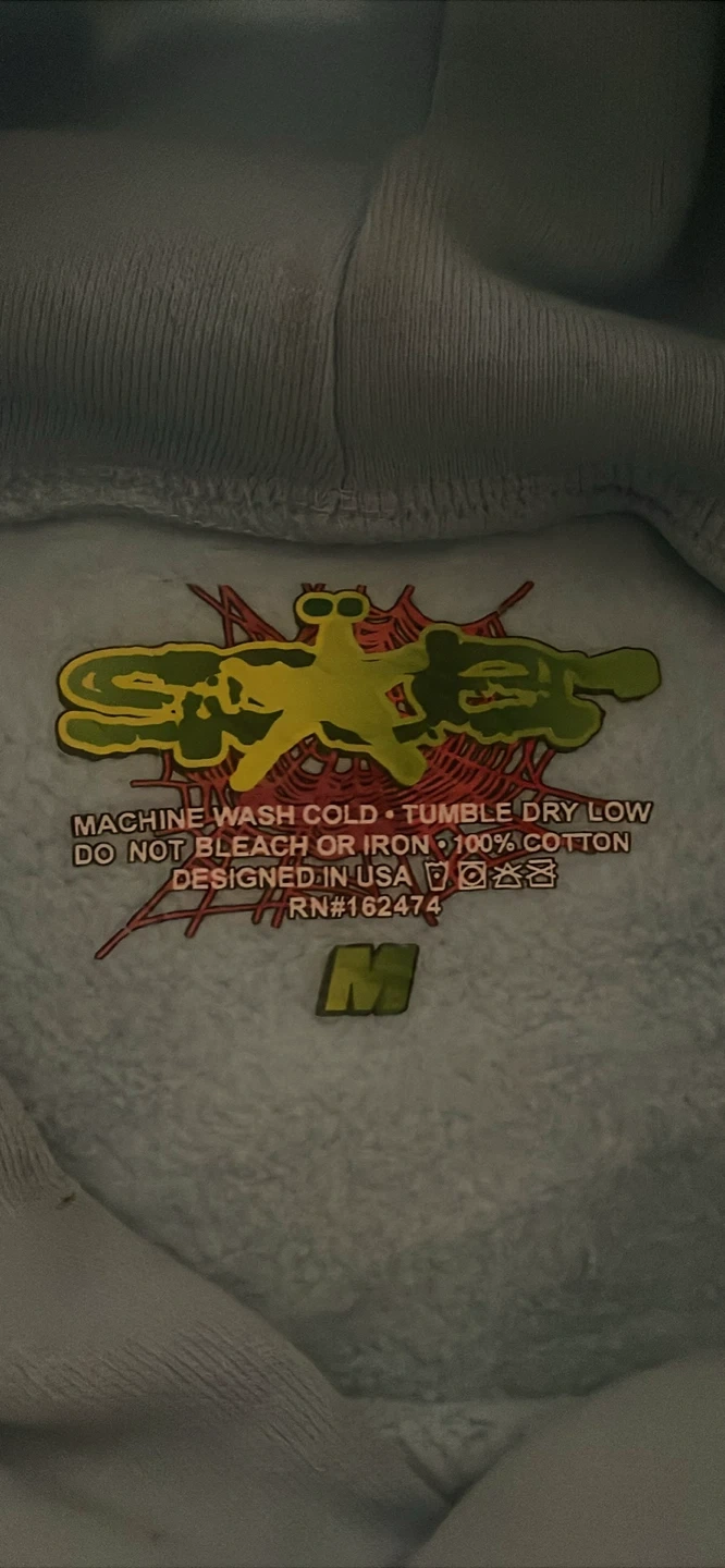 10Selling a Sp5der hoodie in size medium. The hoodie is light blue with a spiderweb design and the word "Sp5der" on the front. It's made of 100% cotton and is in great condition. Machine wash cold, tumble dry low
