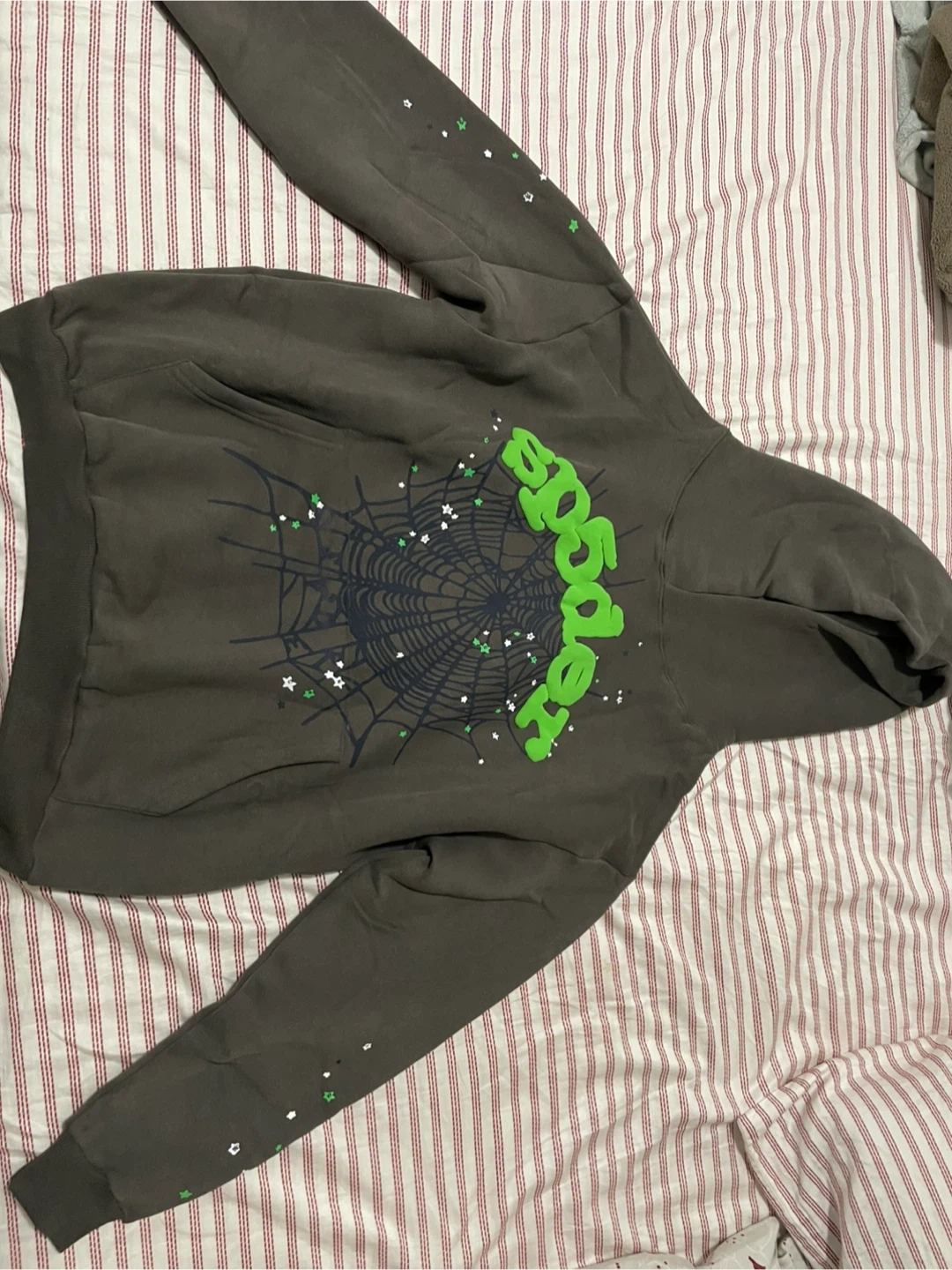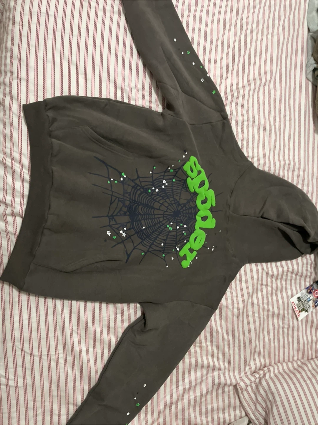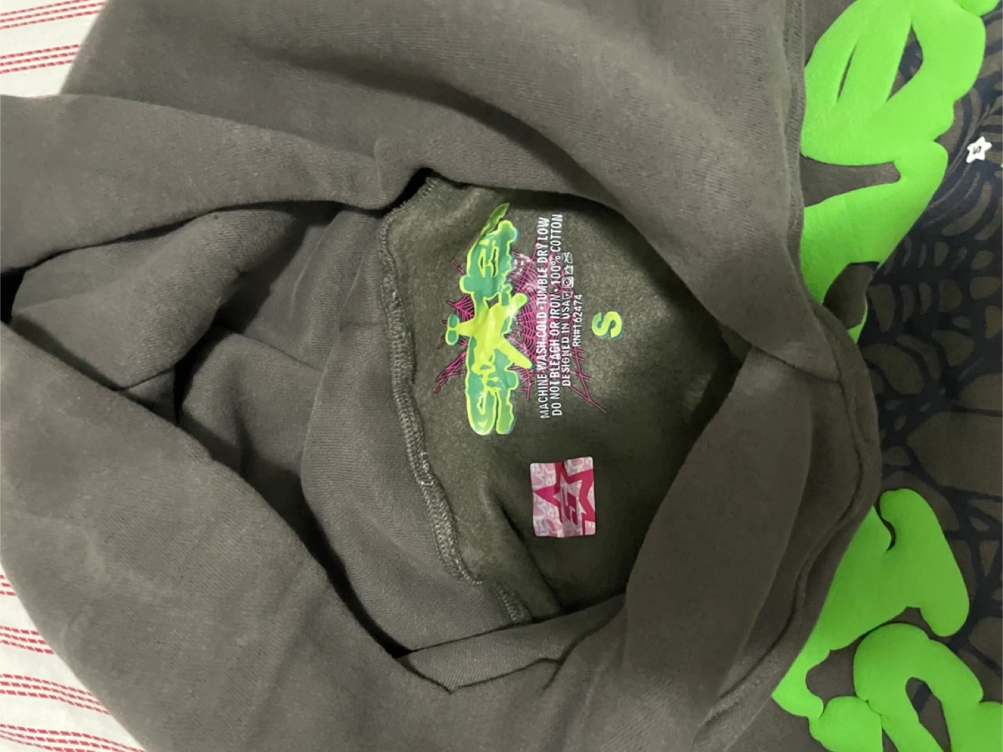 Selling a Sp5der hoodie in size small. It features a spider web design on the back with "Sp5der" written in green. The hoodie is made of 100% cotton.